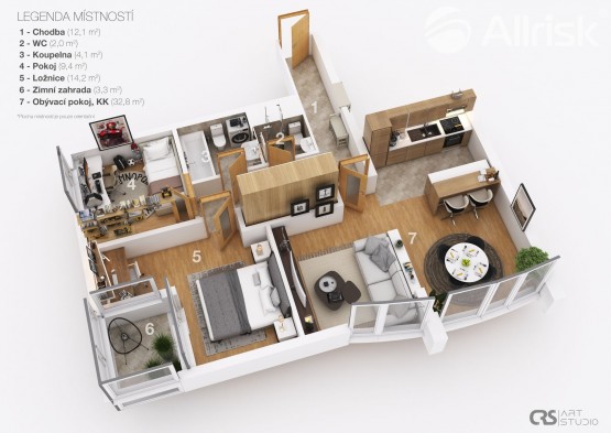 Přiložený 3 D plánek bytové jednotky vám pomůže orientovat se prostorem.
