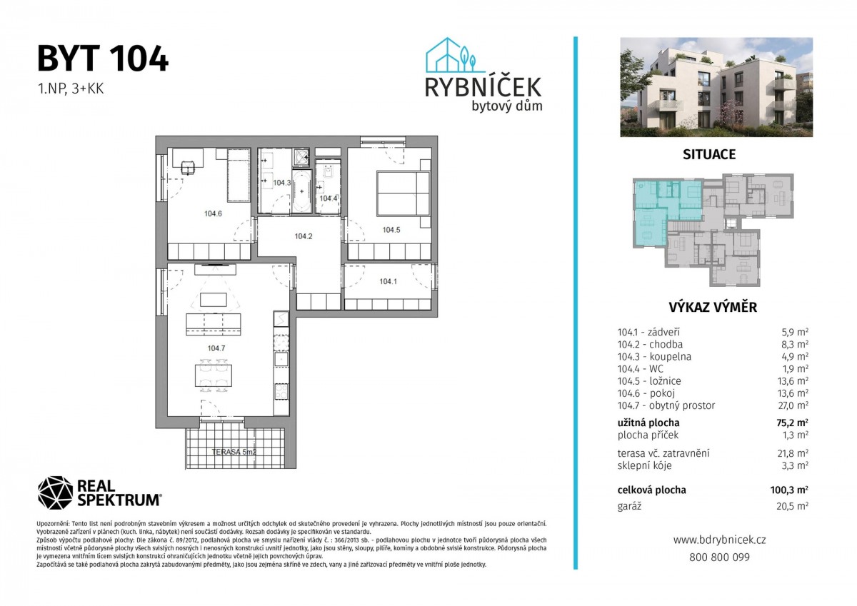 Dispozice: zádveří (5, 9 m²), chodba (8, 3 m²), pokoj s kuchyňským koutem (27, 0 m²), pokoj (13, 6 m²), pokoj (13, 6 m²), koupelna (4, 9 m²), sociální zařízení WC (1, 9 m²), terasa včetně zatravnění (21, 8 m²), sklepní kóje (3, 3 m²), garáž (20, 5 m²)