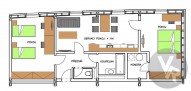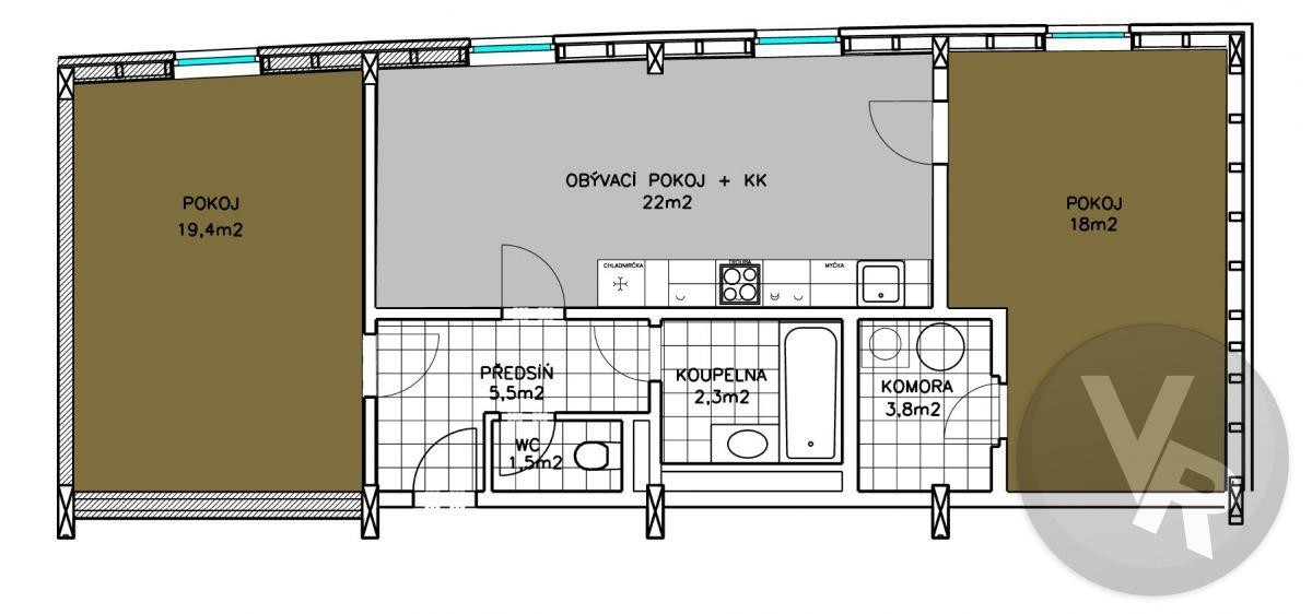 Dispozice: Předsíň, ložnice, koupelna s vanou, samostatná toaleta, obývací pokoj s kuchyňským koutem a další ložnice se šatnou.