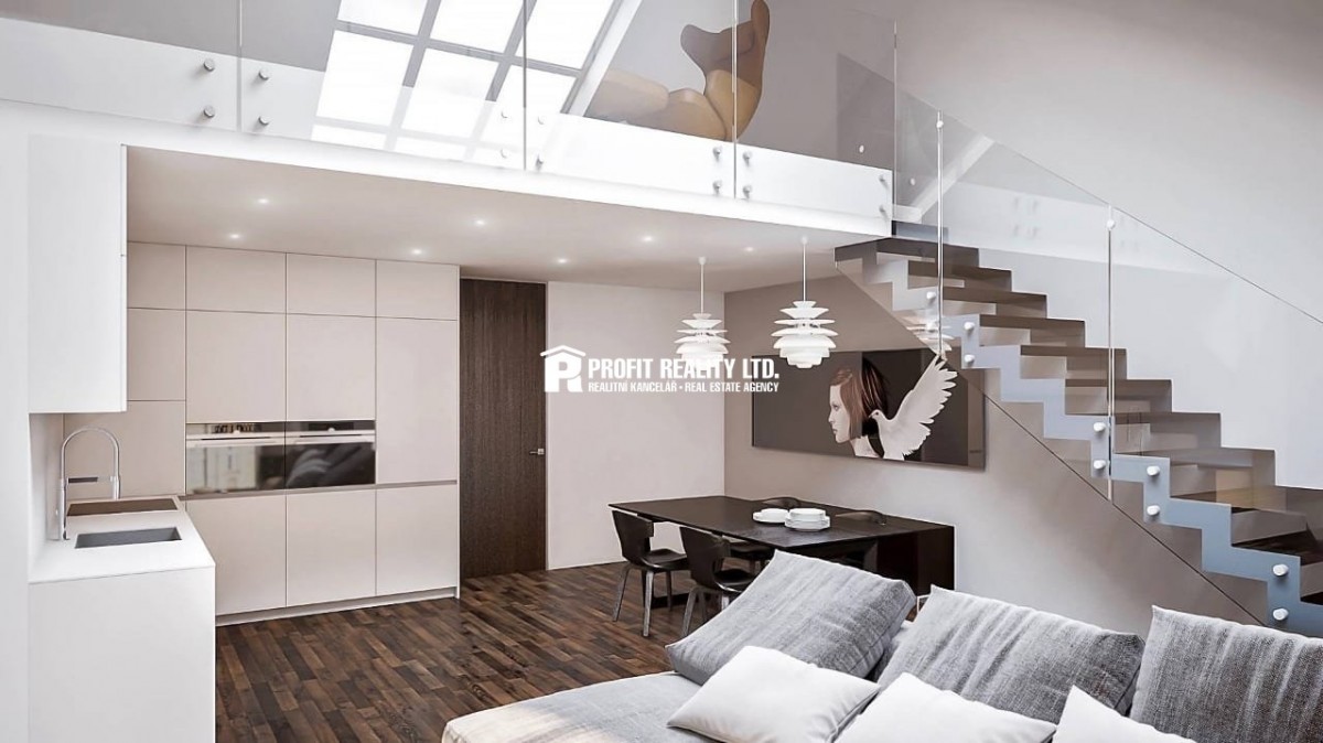Byt vybudovaný jako půdní vestavba zajišťuje dostatek klidu, je v původním udržovaném stavu určen spíše k rekonstrukci a modernizaci. Nový majitel si tak může přizpůsobit prostory v bytě dle svých představ. Lze změnit současnou dispozici, v obytném pokoji je možné vybourat příčku malého pokoje a prostor tak zvětšit nebo patro, které nyní slouží jako pracovna, lze předělat na ložnici se šatnou.