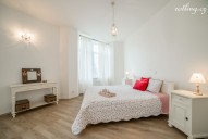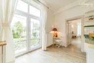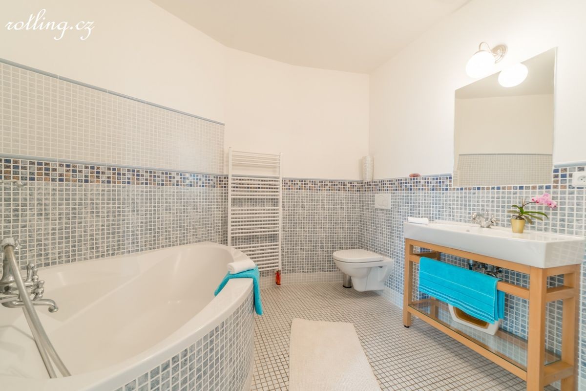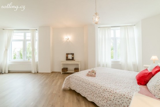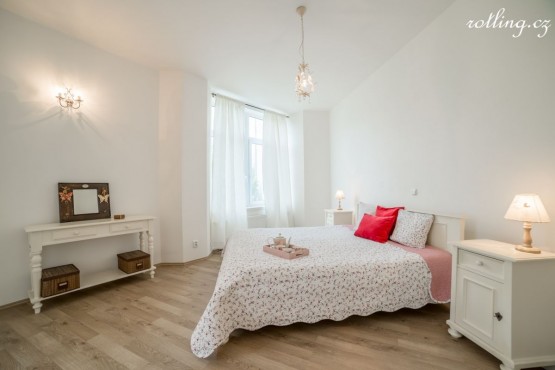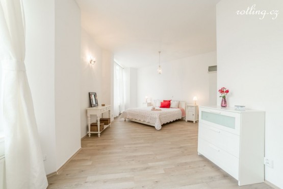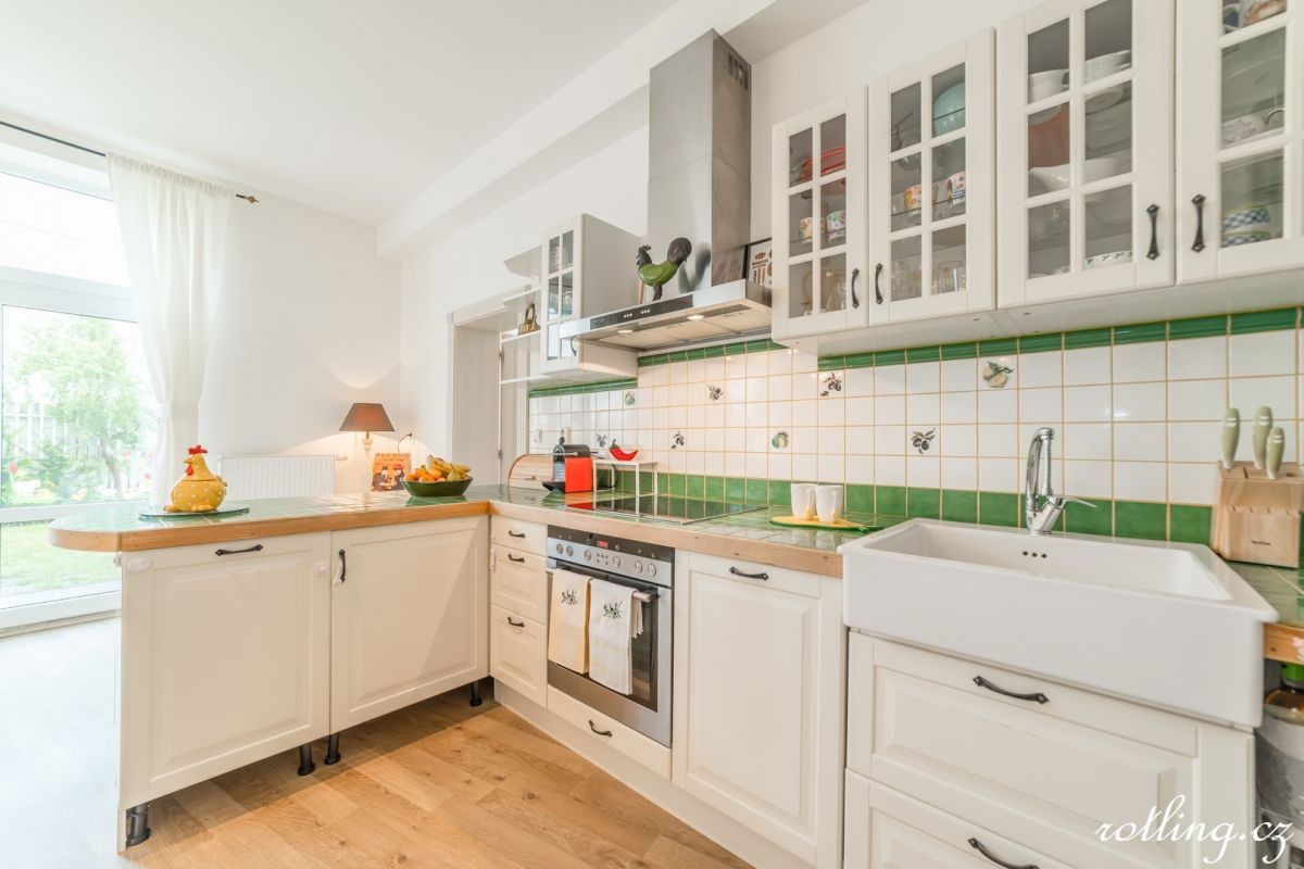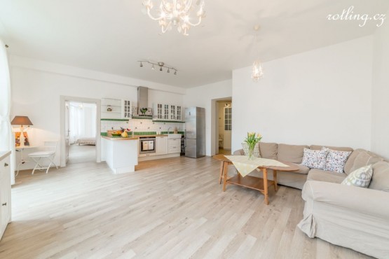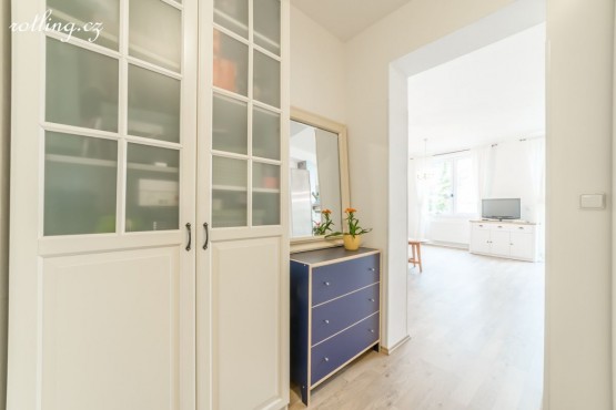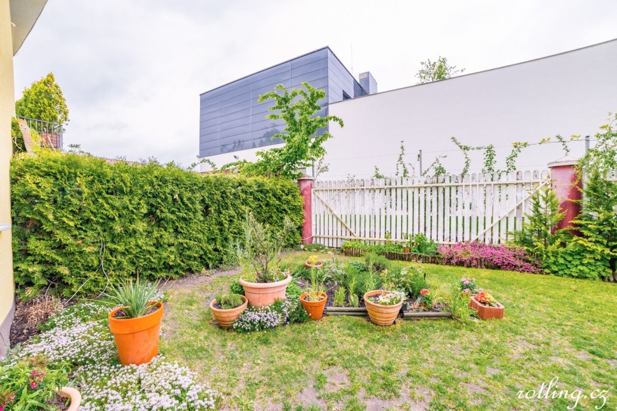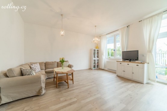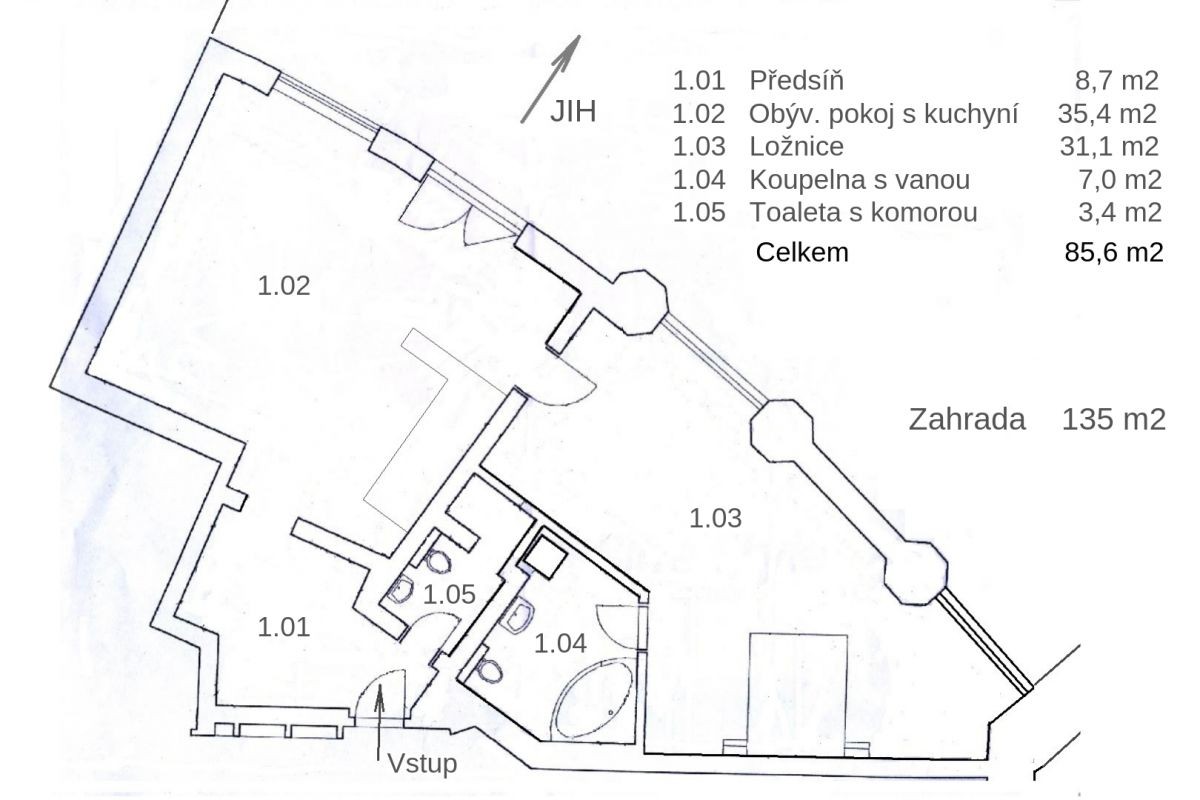 Dominantou bytu je prostorný jižně orientovaný obývací pokoj s otevřenou kuchyní a dveřmi na zahradu. Dále byt nabízí velkou ložnici (vytvořenou z dvou menších pokojů a chodby) s přístupem do prostorné koupelny s vanou, chodbu a komoru s dostatkem úložných prostor. K využití sklep o ploše 1, 7 m2.