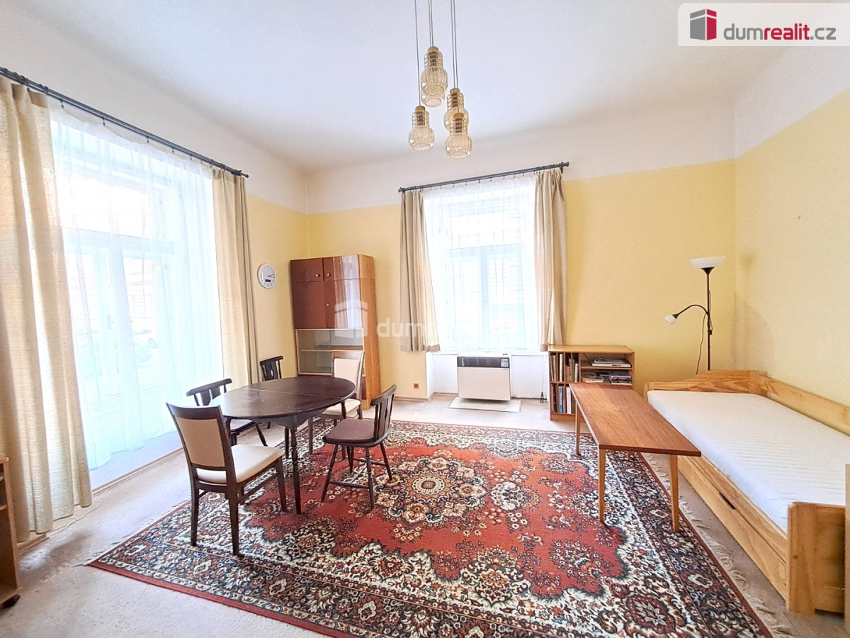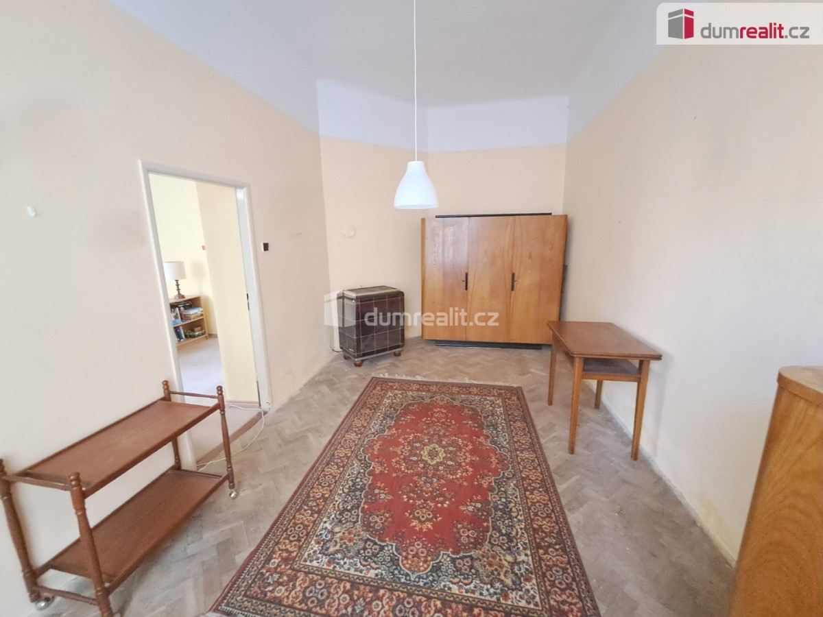 Byt se nachází ve zvýšeném přízemí. Dispozičně 3+kk (2+1), hala, koupelna a sociální zařízení WC. Pokoj s kuchyňským koutem má téměř 26 m², druhý pokoj 27 m² a ložnice 16 m², dále hala 11 m², koupelna se sprchovým koutem 2, 7 m² a toaleta s místem pro umístění pračky 2 m². Hala s koupelnou a toaletou byla nově rekonstruována, pokoje jsou udržovány. Kuchyňský kout je možné přemístit do většího pokoje a ponechat tak další samostatnou ložnici se dvěma okny směřujícími do boční ulice. Výhodou jsou i vysoké stropy pro možnou instalaci pater na spaní. Podlahy tvoří dlažba, linoleum a ve dvou pokojích celkem zachovalé parketová podlaha, ohřev teplé vody el. bojlerem, vytápění 2 krát nové WAW, 1 krát akumulační kamna, topný žebřík. Možno instalovat 3. WAW nebo rozvod ÚT s plynovým kotlem.