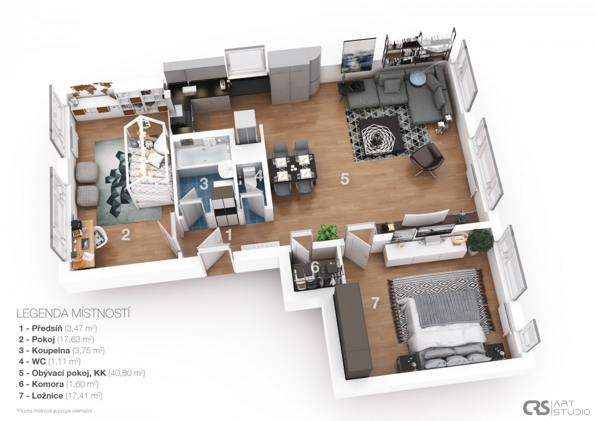 Byt s komorou uvnitř je velice prakticky prostorově řešený, s dispozicí <...abbr title="3 pokoje + kuchyňský kout">3+kk o užitné ploše 87 m2 poskytne pohodlné zázemí pro rodinu s dětmi. Obývací pokoj s kuchyňským koutem je velký 40, 80 m2, ložnice se vstupem z obýváku má 17, 41m2, dětský pokoj je o rozměru 17, 63 m2. Celý byt má na podlahách pravé dubové parketová podlaha, nově lakované, okna jsou opatřena bezpečnostními skly, také vstupní dveře jsou certifikované bezpečnostní.