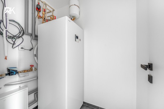 Dům disponuje dvěma toaletami, dvěma technickými místnostmi a jeho vytápění i ohřev vody zajišťuje úsporné tepelné čerpadlo Toshiba s podlahovým vytápěním v celém objektu. Dále je připravena kabeláž pro instalaci fotovoltaiky a příprava pro klimatizaci Toshiba. Díky energetické třídě B jsou provozní náklady velice nízké.