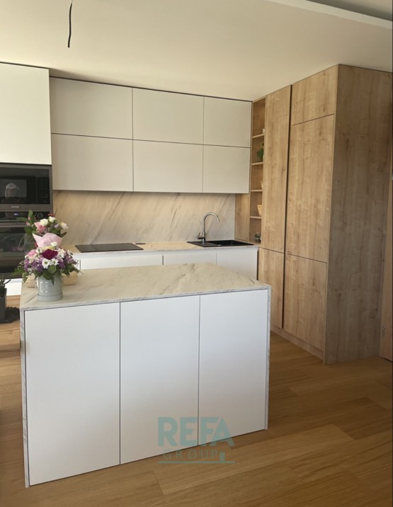 Byt se bude prodávat částečně zařízený s nábytkem vyrobeným od truhláře přímo na míru (kuchyňská linka, vestavěná skříň v ložnici a technické místnosti).
