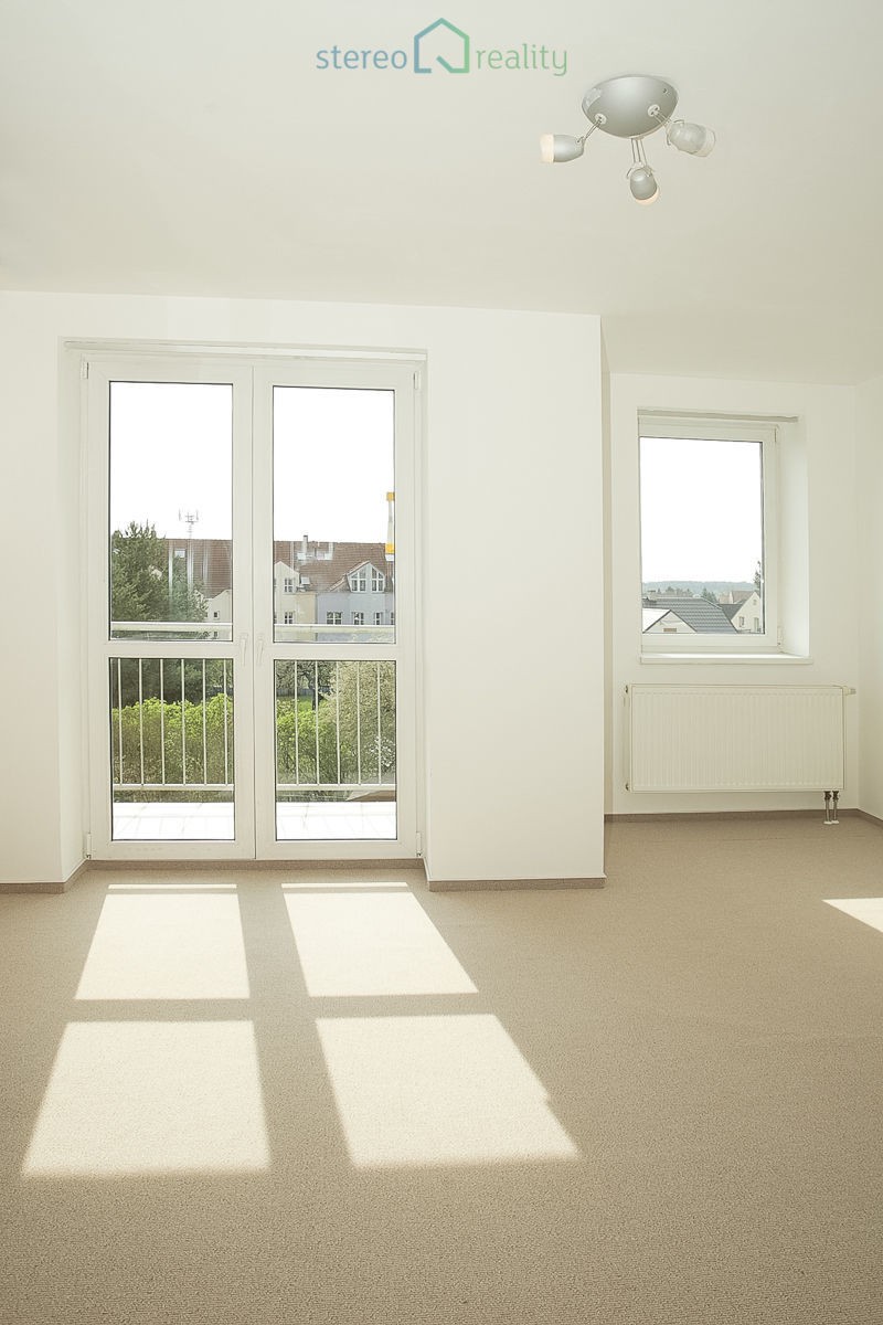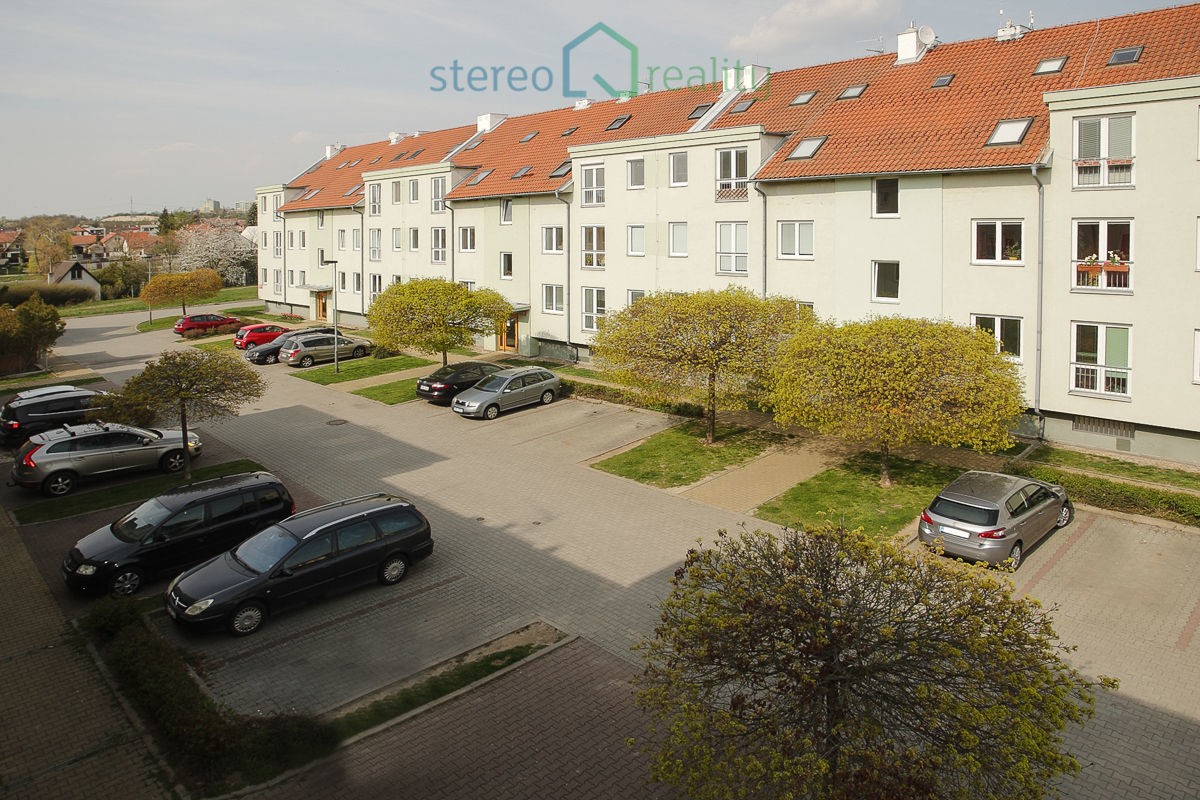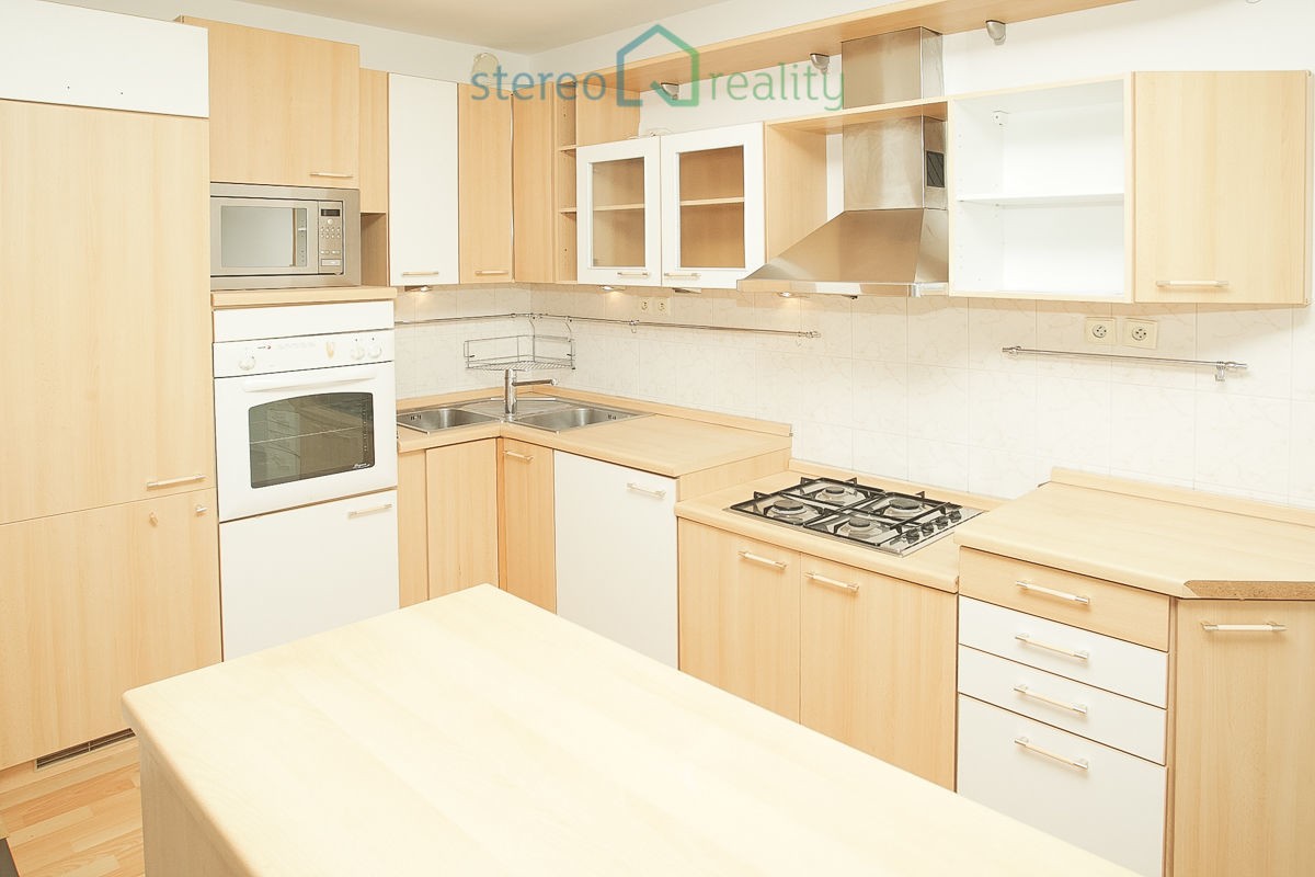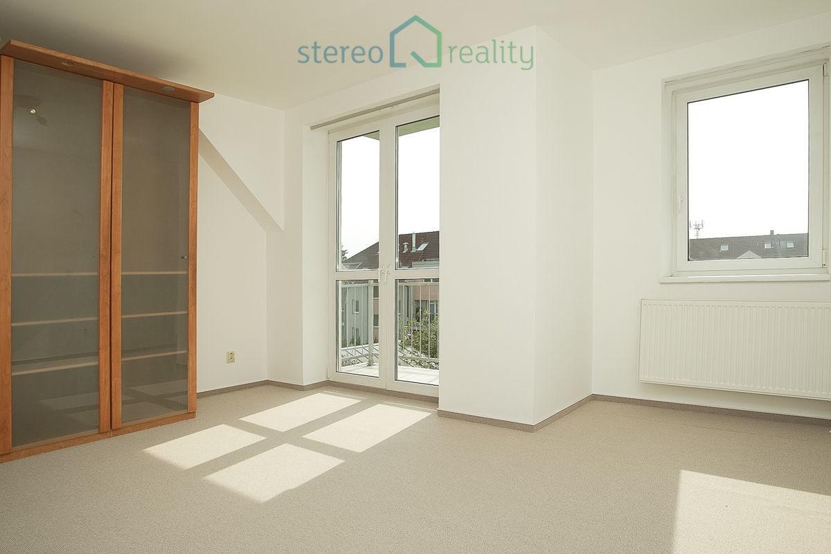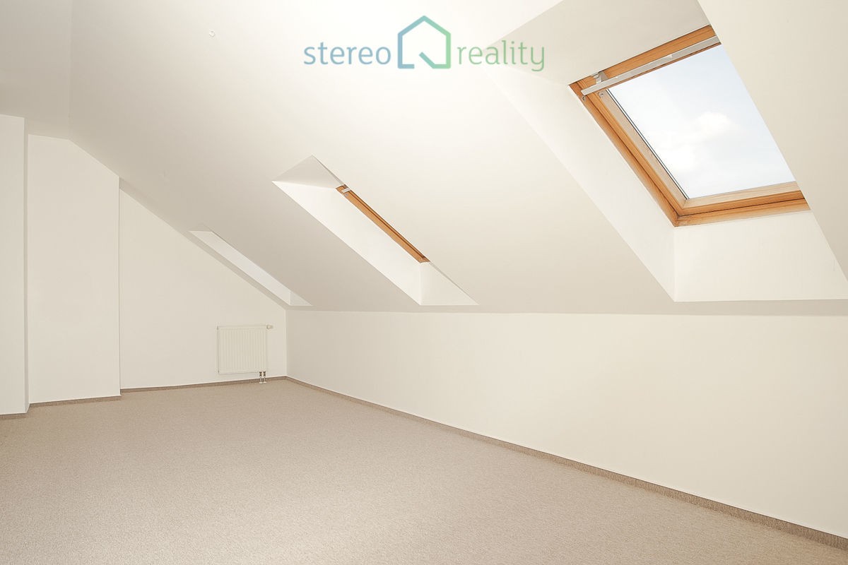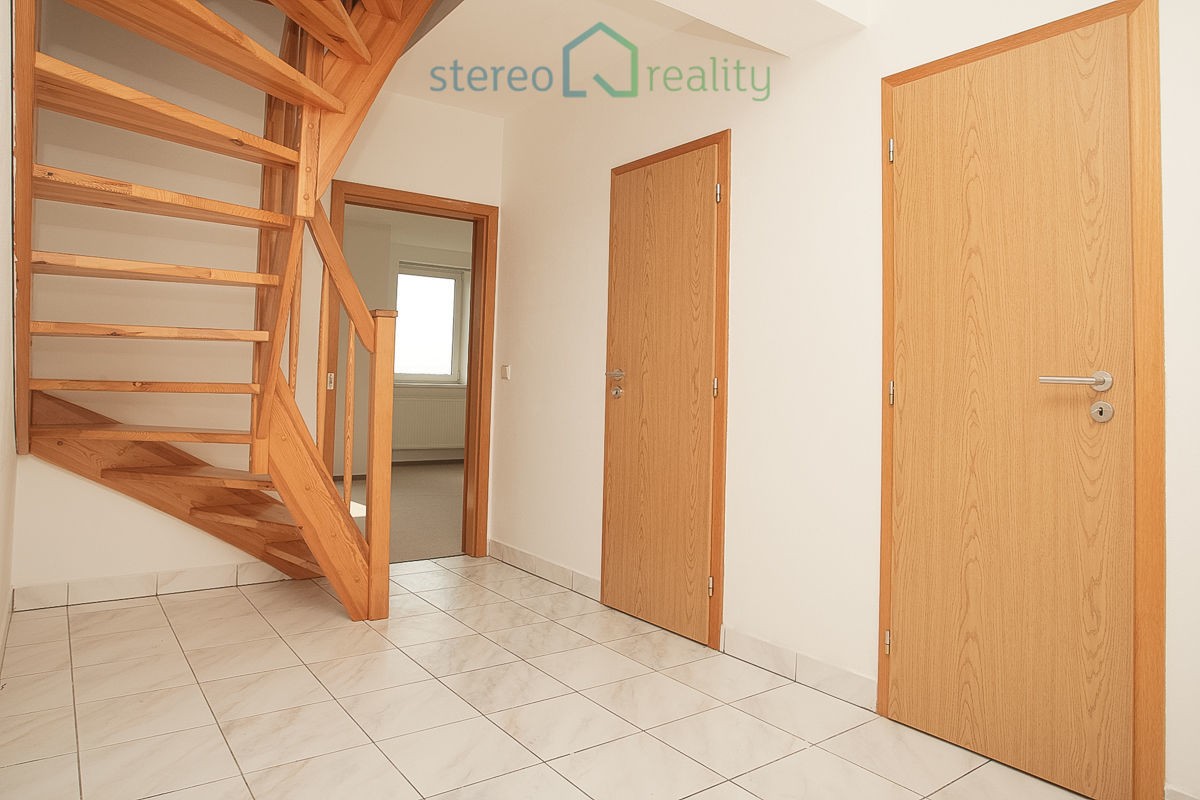 V mezonetovém bytu s dispozičním řešením 3+kk naleznete v prvním podlaží vstupní halu, ze které je vstup do velké koupelny s vanou a samostatné toalety. Ve stejném podlaží směrem na východ je prostorný obývací pokoj s kuchyňským koutem, který je standartně vybaven, dále na západ orientovaná je ložnice s balkonem a výhledem do zahrad domu. V hale je schodiště vedoucí do druhého podlaží, kde je velký pokoj, který je možno rozdělit na dva menší pokoje. K bytu patří sklep v přízemí domu o rozloze 4 m2.