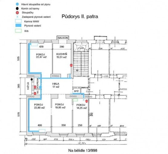 Dispozici prostorného bytu situovaného ve 2. NP (druhé nadzemní... patro) bytového domu tvoří vstupní hala(17m), samostatná kuchyň se vstupem na balkon(15, 51m), tři pokoje s okny do ulice(22, 8m, 19, 95m, 14, 25m) , ložnice s okny do vnitrobloku(22, 47m), koupelna, samostatná toaleta, balkon(3, 7m), komora a světlík. V současné době probíhá jednání o rozdělení zrekonstruovaných sklepních prostor. Dále má každá bytová jednotka k dispozici část zahrady ve vnitrobloku.
