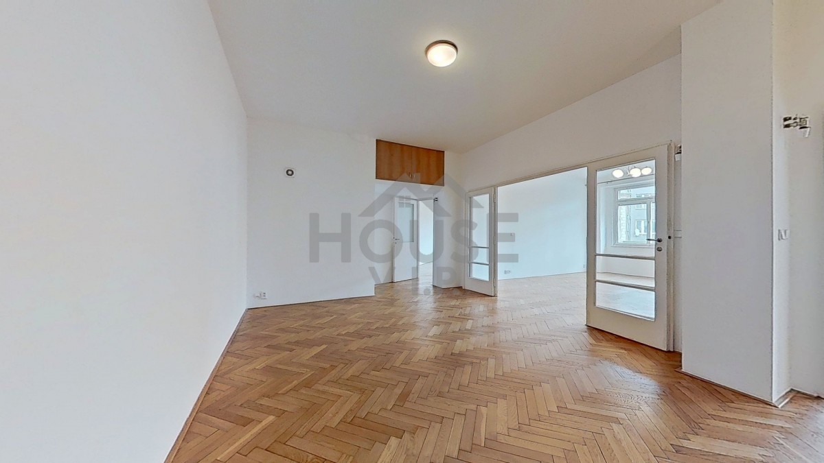 Byt se nachází ve 3. patře domu ze 30. let včetně výtahu a velkoryse řešenými byty, s vysokými stropy a velkými francouzskými okny, která zajišťují výjimečnou světlost všech obytných místností. Komfort bydlení podtrhují zachovalé dubové parketová podlaha ve všech pokojích a na svou dobu převratné stropní vytápění, které zajišťuje rovnoměrné a úsporné teplo bez rušivých radiátorů.