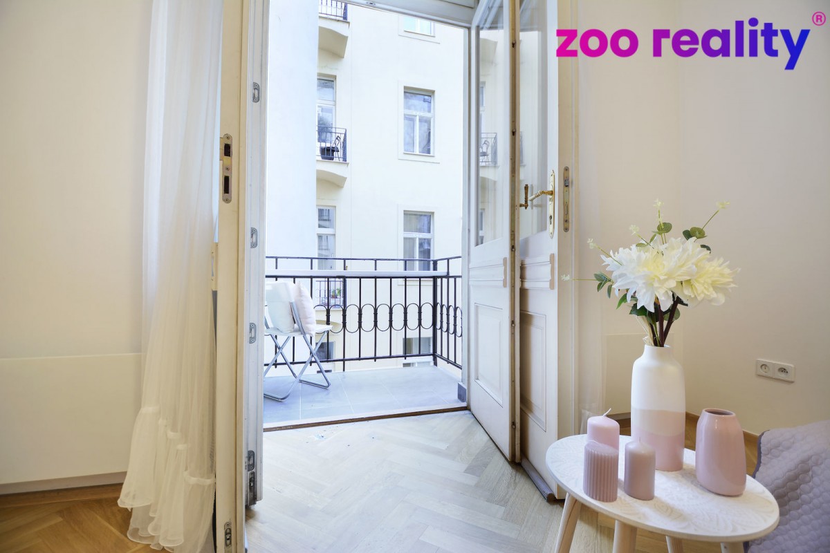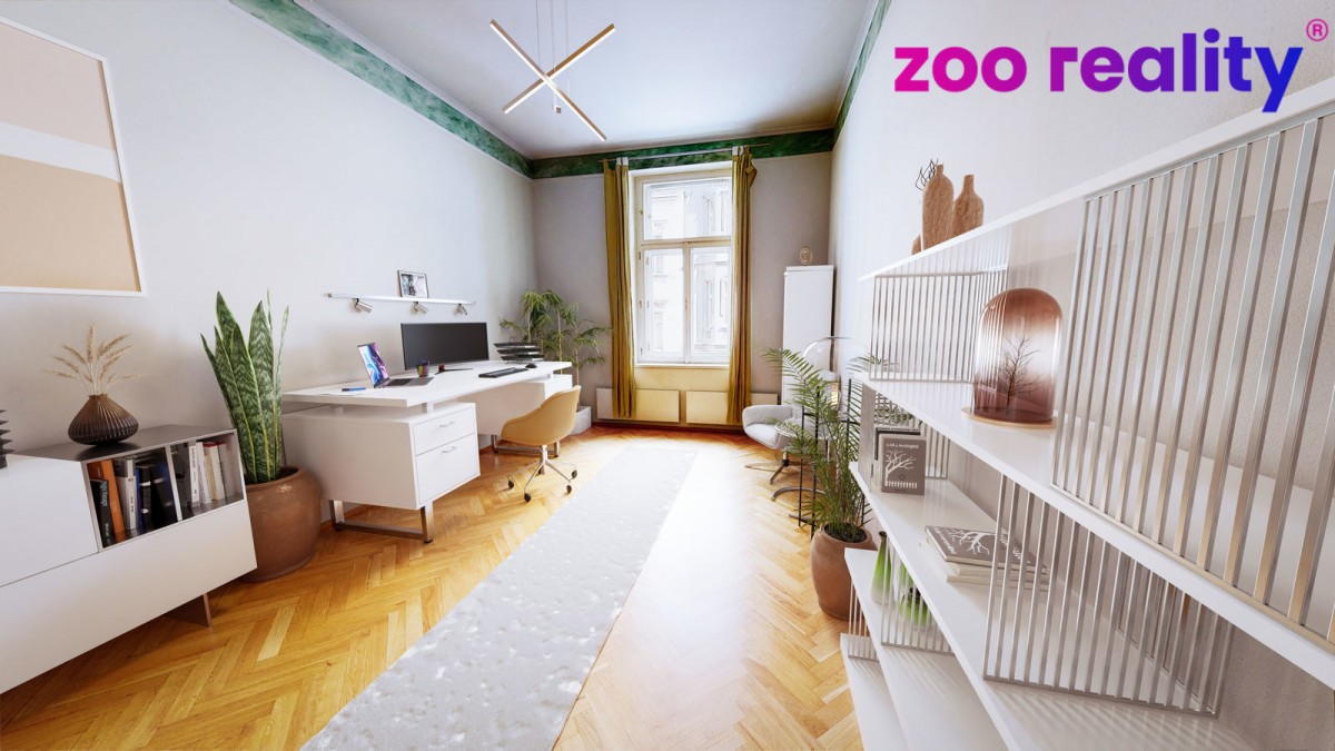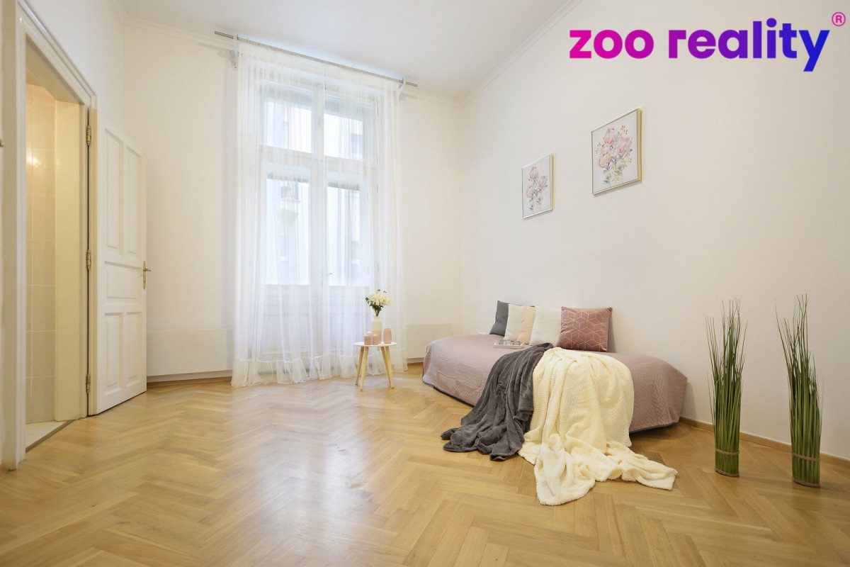 Above - standard flat with four bedrooms and a kitchen, 155m2, in Prague 1, Vojtěšská street for sale. The property is located in the centre of Prague, specifically in the New Town in the immediate vicinity of the Vltava River and the Mánes Gallery. Wenceslas Square or the National Theatre is within walking distance. The flat itself is located on the 2nd floor of a renovated Art Nouveau house, which was built at the beginning of the 20th century. After opening the front door you enter the central hallway that runs through the entire flat, from which you enter the individual rooms and which includes a separate toilet with a washbasin. At first glance you will be impressed by the generously designed living room, which is connected to the dining room and kitchen, the kitchen unit is made up of a single island. In the flat there are three more bedrooms, one of which has its own separate bathroom with shower and access to a smaller balcony facing the courtyard. In all rooms there are wooden parquet floors as floor coverings. The main bathroom has both a bath and a shower, where underfloor heating is a matter of course.