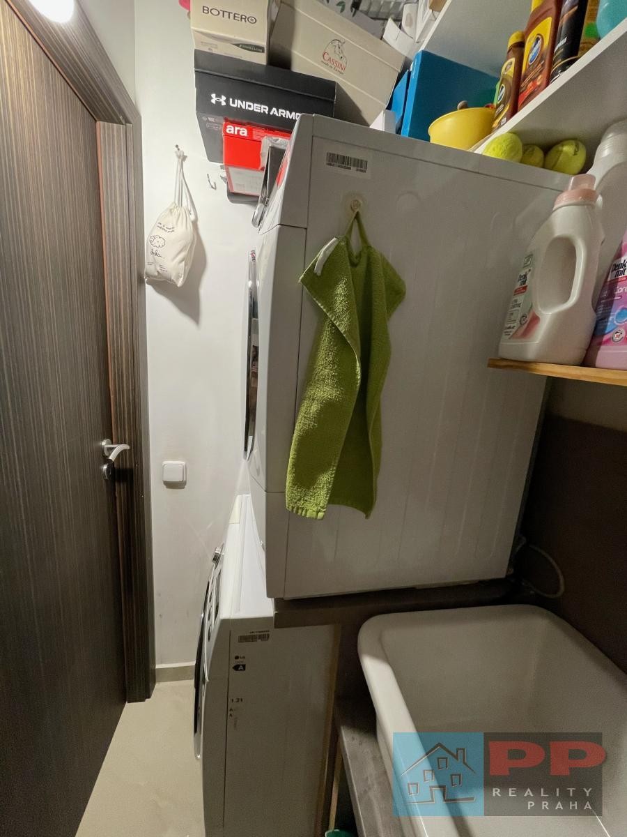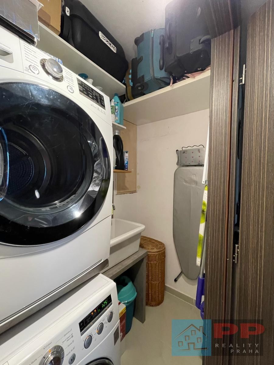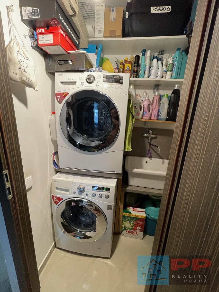 Samostatná technická místnost s pračkou, sušičkou a umyvadlem určeným pro praní a technické účely.