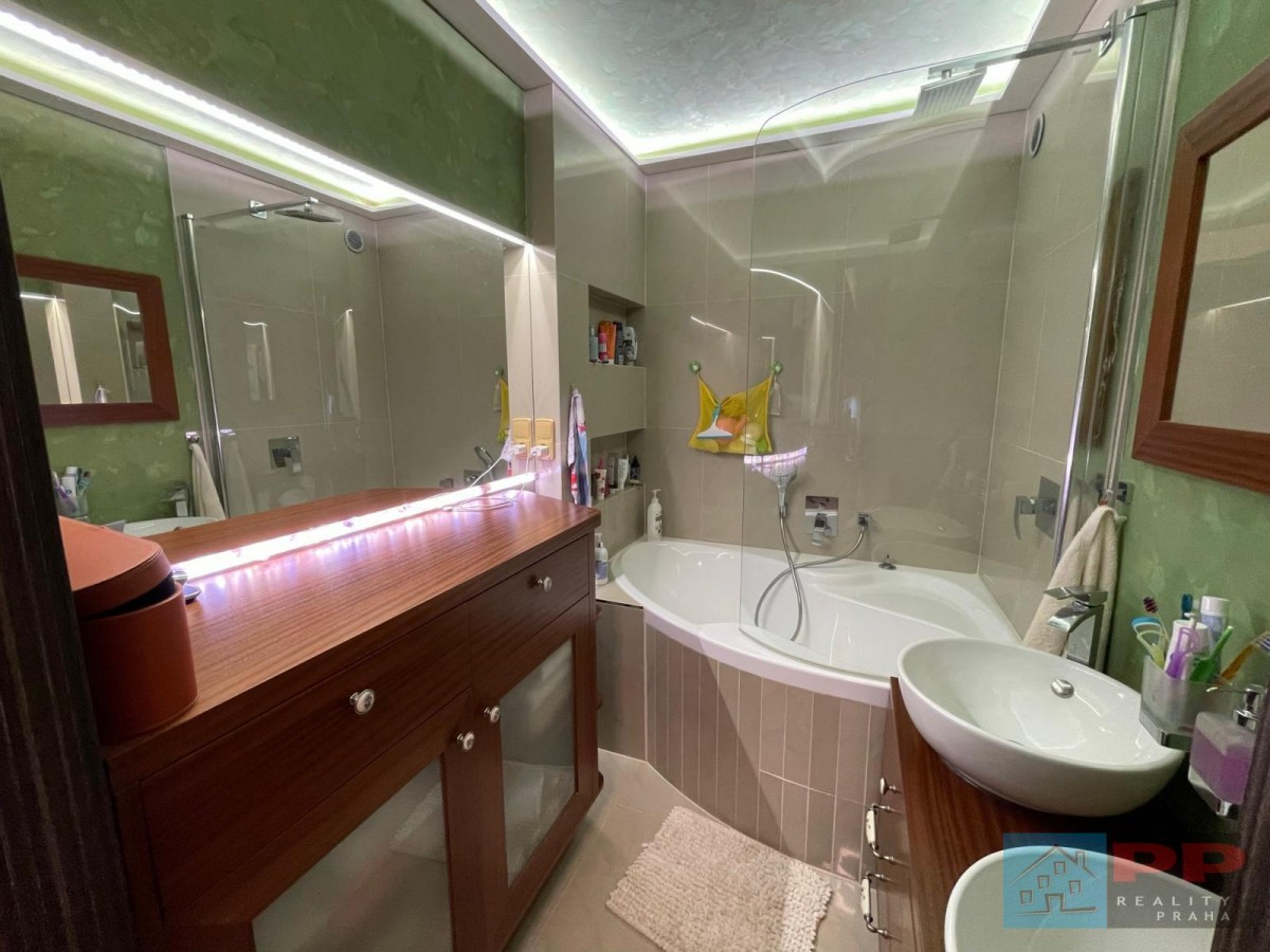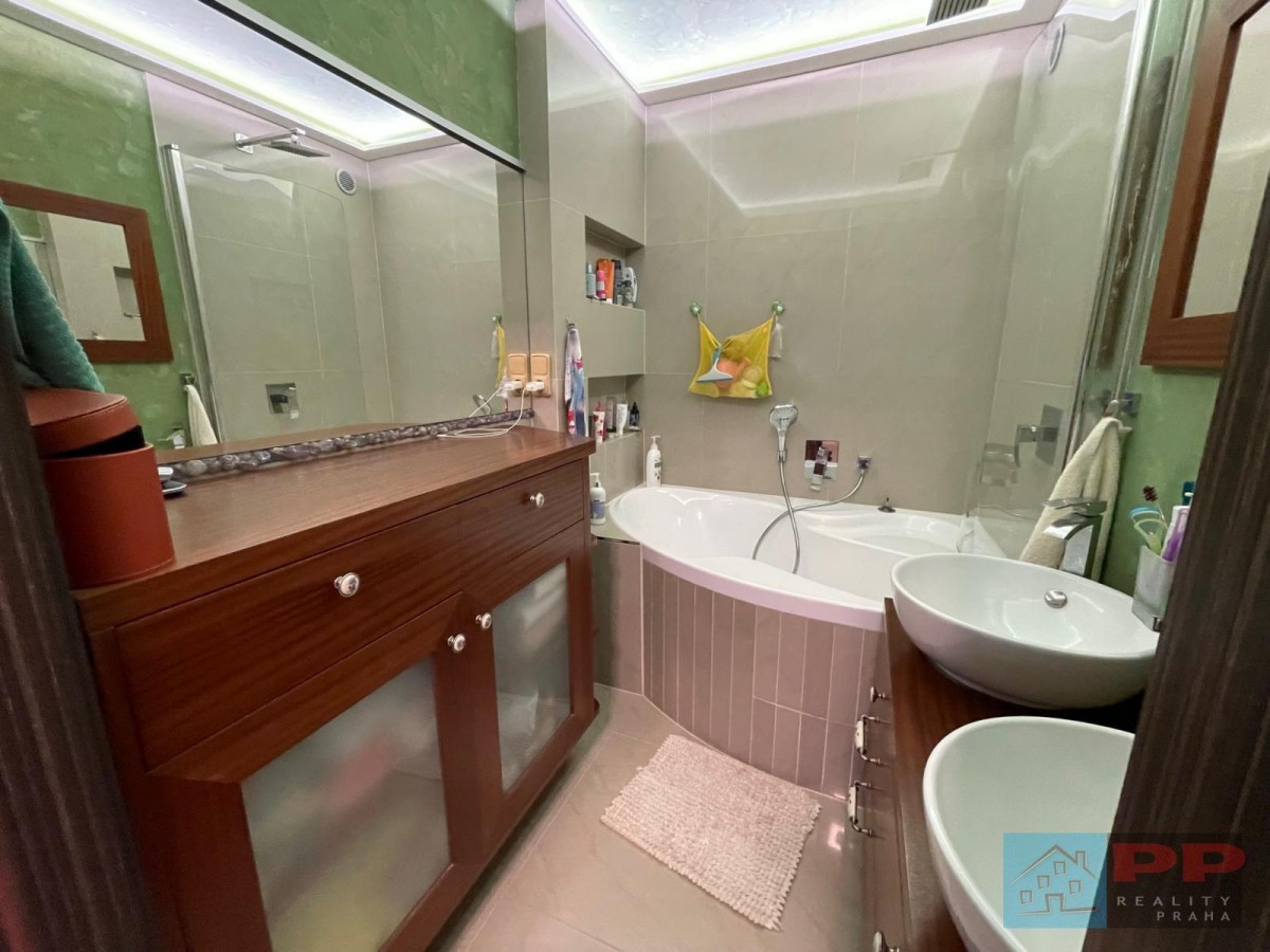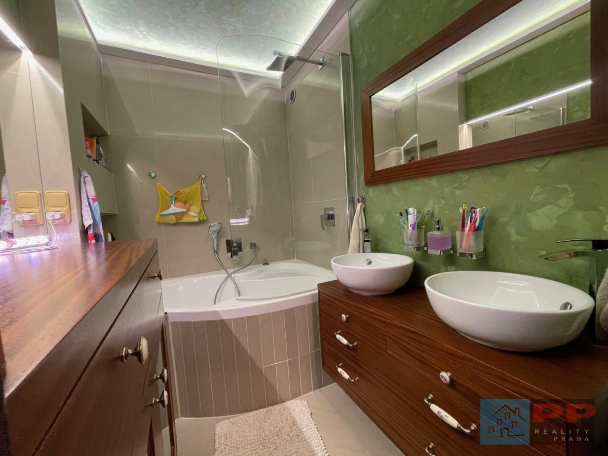 Luxusně zařízená koupelna splní požadavky i náročnějších uživatelů. Obsahuje rohovou vanu, elegantní mahagonový nábytek vyrobený na míru a dvě umyvadla, což zajišťuje pohodlí zejména pro vícečlennou rodinu. K dispozici je také samostatný sprchový kout se sprchovým deštníkem, který nabízí maximální komfort.