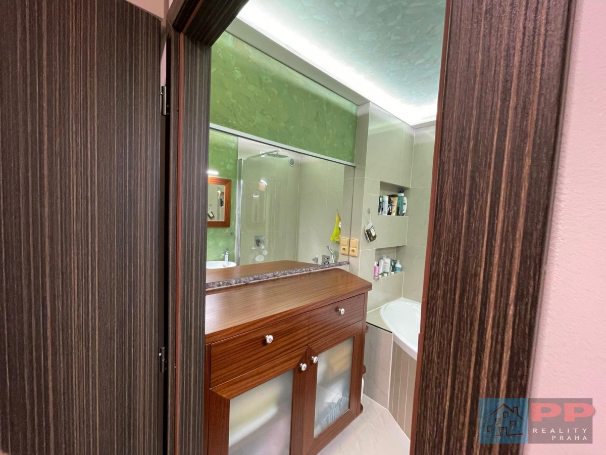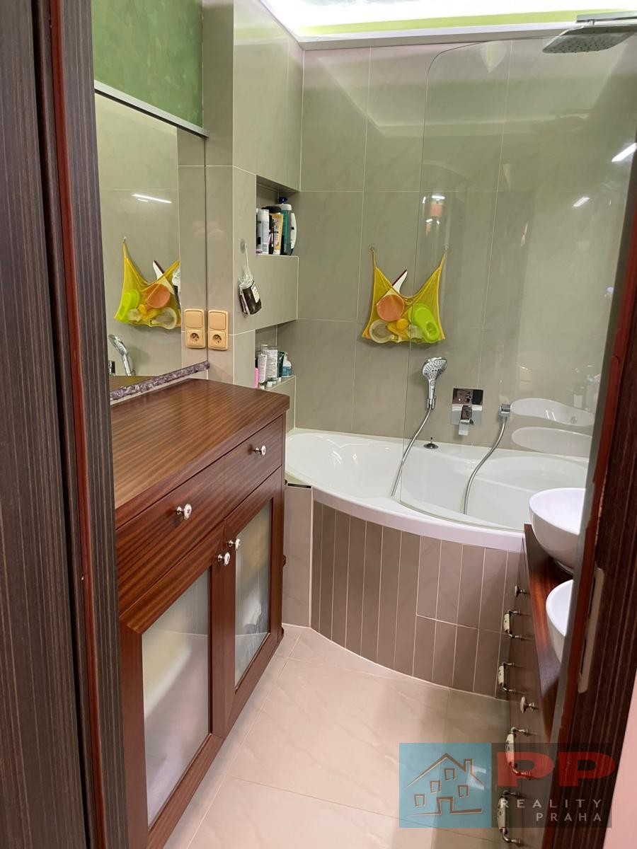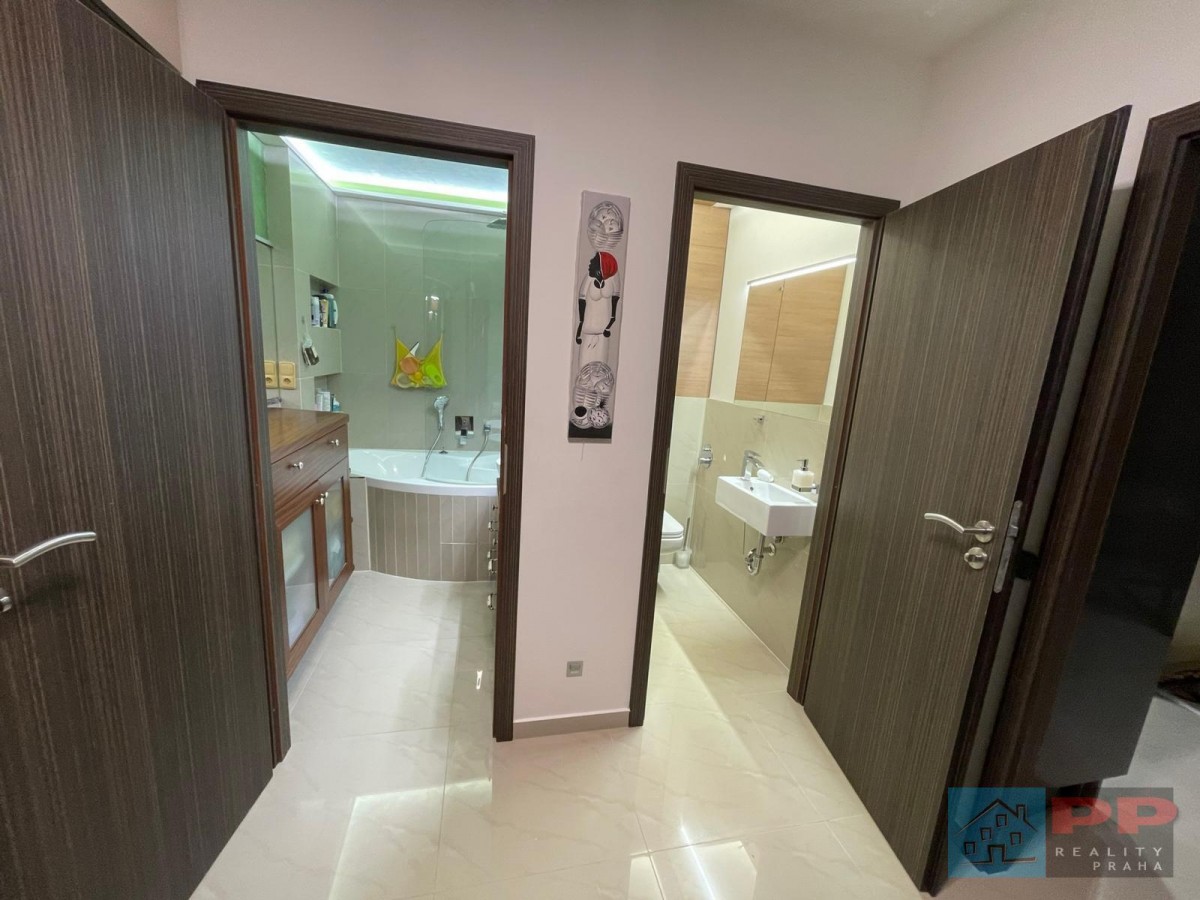 Luxusně zařízená koupelna splní požadavky i náročnějších uživatelů. Obsahuje rohovou vanu, elegantní mahagonový nábytek vyrobený na míru a dvě umyvadla, což zajišťuje pohodlí zejména pro vícečlennou rodinu. K dispozici je také samostatný sprchový kout se sprchovým deštníkem, který nabízí maximální komfort.