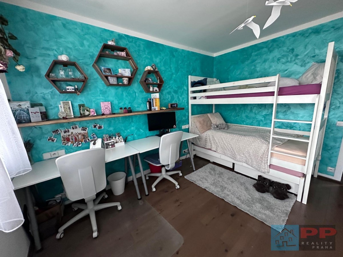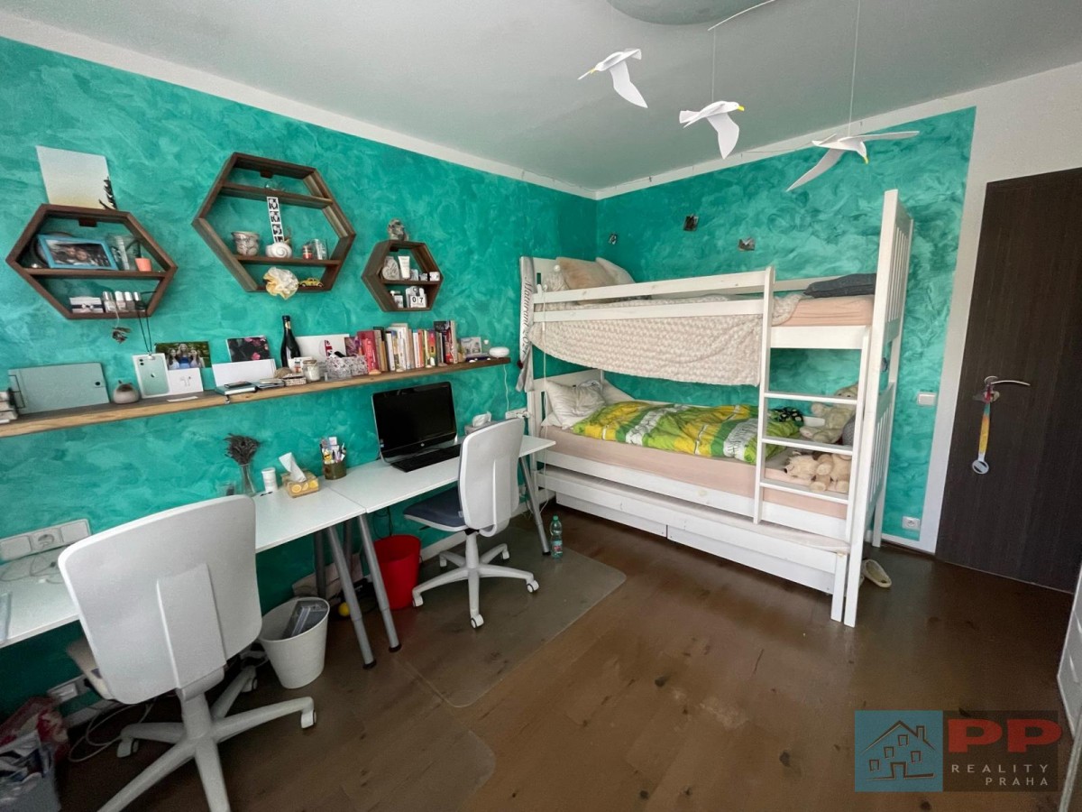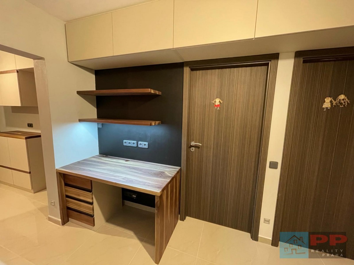 Chytré využití prostoru doplňují na míru vyrobené vestavěné skříně a pracovna, která je kompletně vybavena elektroinstalací a kvalitním nábytkem z masivního dřeva (ořech).