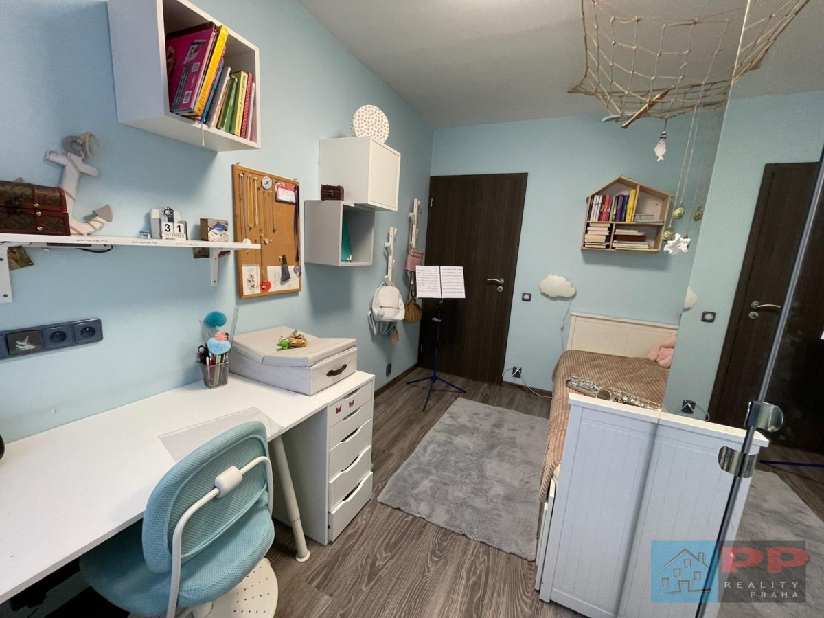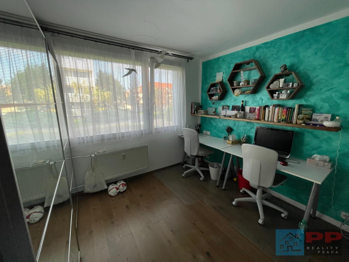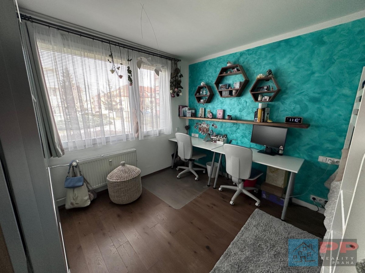 Chytré využití prostoru doplňují na míru vyrobené vestavěné skříně a pracovna, která je kompletně vybavena elektroinstalací a kvalitním nábytkem z masivního dřeva (ořech).