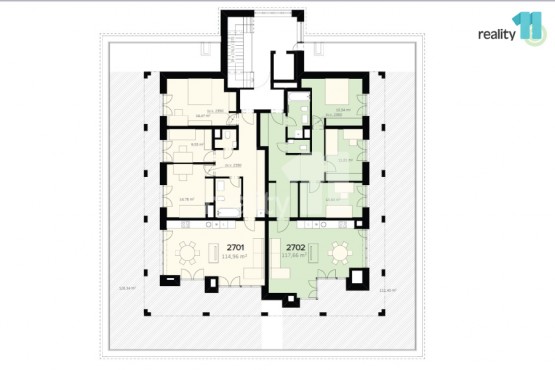 Bytové jednotky v posledním patře každého domu jsou pouze dvě, žádný další sousedící byt zde není, součástí je jedno parkovací stání v podzemní garáži a sklepní kóje.
