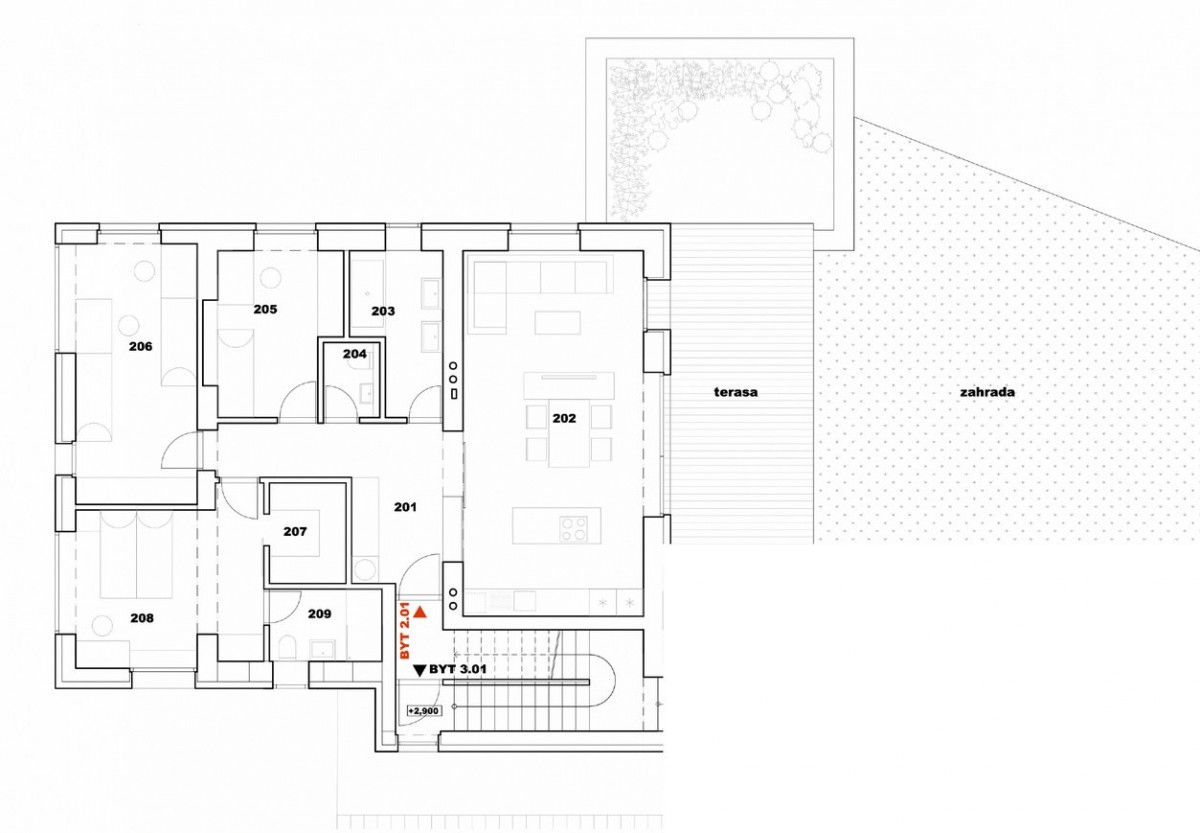 Prodej nadstandardní novostavby bytu 4+kk v Brně – Jundrov, ulice Březová. Jedná se o moderně navržený projekt pouze 4 bytových jednotek ve velice žádané a klidné lokalitě měst...a Brna. Bytový dům je citlivě umístěn mezi okolní zástavbu rodinných domů, díky čemuž je umocněna atmosféra rodinného bydlení. K bytové jednotce o čisté užitné výměře 101, 6 m2 náleží vlastní část pozemku – zahrada o výměře 84, 2 m2 přístupná přímo z bytu, terasa o velikosti 23, 7 m2 + střešní zeleň 18, 5 m2 a dvě parkovací stání pod přístřeškem v uzamykatelném dvoře. Byt. jednotka se situována v prvním patře - 2. NP (druhé nadzemní patro), umožňující vstup na vlastní pozemek přímo z obývacího pokoje. Velkou výhodou je netradiční dispozice bytu, která nabízí komfortní výměru obývacího pokoje s kuchyňským koutem, dvě koupelny a spoustu úložného prostoru v bytě. Velký důraz byl rovněž kladen na maximální proslunění interiéru. Samozřejmostí je vysoký standard stavebních prvků, zařizovacích předmětů a vybavení bytu. V současné chvíli probíhá výstavba, jejíž předpokládané dokončení je naplánováno na konec roku 2022. Kupec si tudíž, za předpokladu včasné rezervace, ovlivní a sám vybere druhy jednotlivých povrchů a zařizovací předmětů dle vlastní preference a vkusu. Tento atraktivní projekt je ojedinělou příležitostí koupě novostavby bytové jednotky v jedné z nejžádanějších vilových lokalit města Brna. Byl naprojektován s maximální snahou o zasazení netradiční architektury domu do okolní zeleně s využitím nadstandardních materiálů. Nachází se na úpatí místního lesa – obory Holedná, přitom stále v relativní blízkosti centra města.