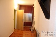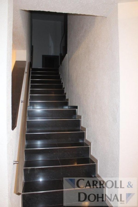 Ze zádveří (vestavěná skříň) se po schodech dostaneme do prostorné chodby, rovněž s úložnými prostory. Z chodby jsou přístupné: samostatné sociální zařízení WC, koupelna s rohovou vanou, dva samostané pokoje, jeden z vestavěnou skříní, komora(původně druhá garáž) a kuchyň s obývacím pokojem a vstupem na terasu. Z obývacího pokoje je pak přístup do třetího samostaného pokoje, který má také svůj vstup na terasu.
