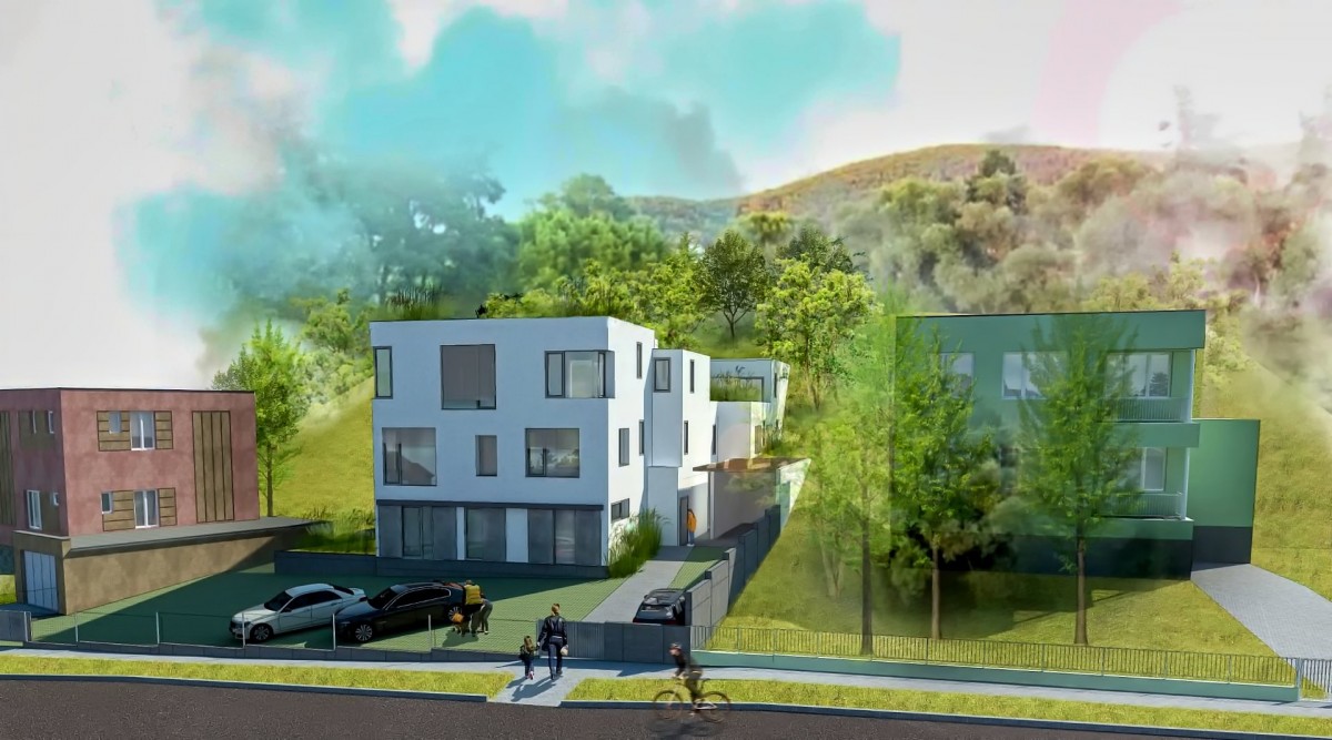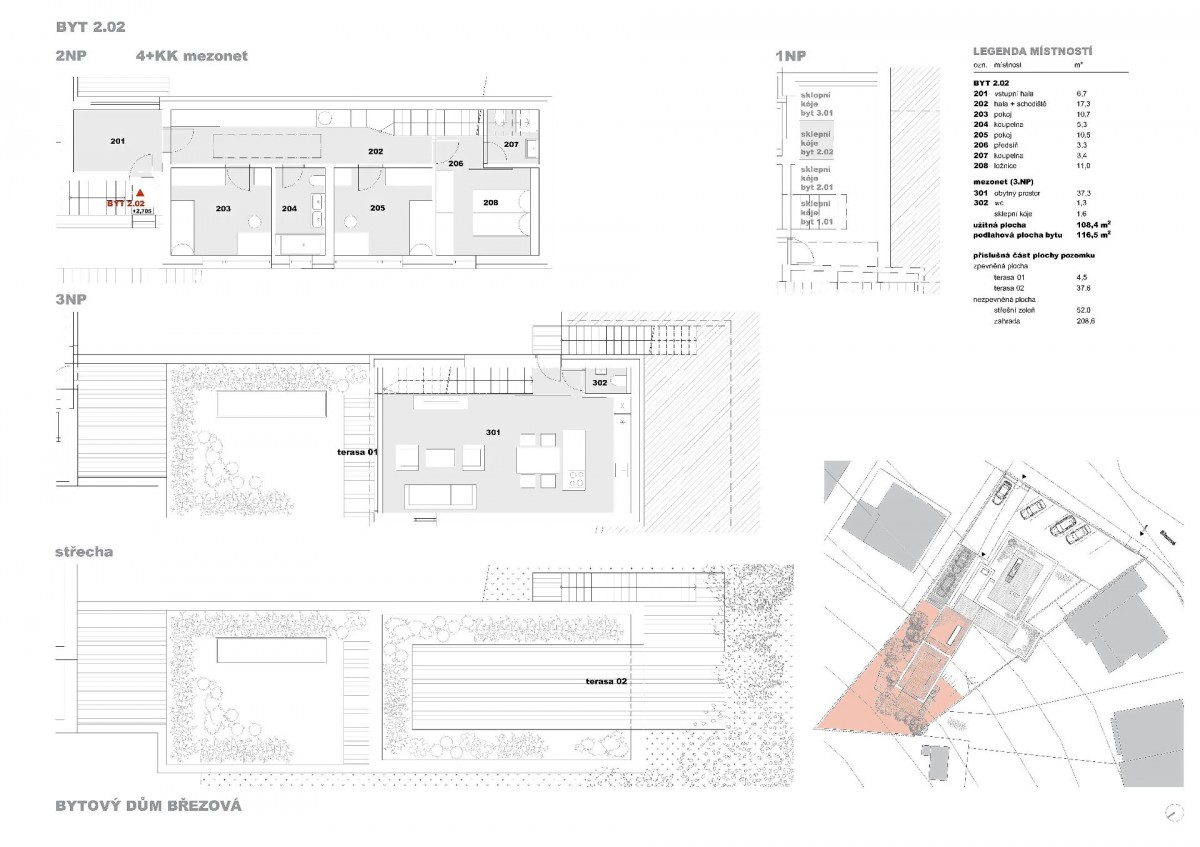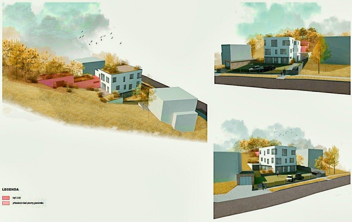 Prodej nadstandardní novostavby mezonetového bytu 4+kk se střešní terasou a velkou vlastní zahradou v Brně – Jundrov, ulice Březová. Jedná se o moderně navržený projekt pouze 4... bytových jednotek ve velice žádané a klidné vilové lokalitě města Brna. Bytový dům je citlivě umístěn mezi okolní zástavbu rodinných domů, díky čemuž je umocněna atmosféra rodinného bydlení. K bytové jednotce o čisté užitné výměře 108, 4 m2 náleží dvě terasy o výměře v součtu 42, 1 m2 + střešní zeleň 52 m2, vlastní pozemek – zahrada o výměře 208, 6 m2 a dvě parkovací stání. Byt. jednotka je řešena formou mezonetu, je situována v 2. a 3. NP (třetí nadzemní patro) (první a druhé patro) + střešní terasa, v zadní nově vystavěné zadní části domu. V prvním patře jsou obytné pokoje a sociální zázemí bytu, jeden z pokojů je volně přístupný na část zahrady. Ve druhém patře prostorný obývací pokoj s kuchyňským koutem, s přístupem na terasu, dále z části zahrady je venkovním schodištěm přístup na střešní terasu, na kterou navazuje zbytek pozemku. Netradiční dispozice bytu nabízí dvě koupelny, z každého podlaží přístup na část vlastní zahrady, ze střešní terasy pak úžasný výhled do okolí. Velký důraz byl kladen na maximální proslunění interiéru. Samozřejmostí je vysoký standard stavebních prvků, zařizovacích předmětů a vybavení bytu. V současné chvíli probíhá výstavba, jejíž předpokládané dokončení je naplánováno na červen roku 2023. Kupec si tudíž ovlivní a sám vybere druhy jednotlivých povrchů a zařizovací předmětů dle vlastní preference a vkusu. Tento atraktivní projekt je ojedinělou příležitostí koupě novostavby bytu v jedné z nejžádanějších vilových lokalit města Brna s vlastní zahradou. Byl naprojektován s maximální snahou o zasazení netradiční architektury do okolní zeleně s využitím nadstandardních materiálů.