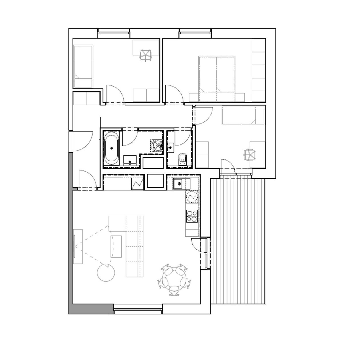 Dispozice bytu: chodba (10, 4 m²), obývací pokoj s kuchyňským koutem (33, 6 m²), pokoj (14, 0 m²), pokoj (10, 9 m²), pokoj (9, 5 m²), koupelna (4, 0 m²), sociální zařízení WC (1, 9 m²), terasa (15, 0 m²), sklep (3, 9 m²), parking