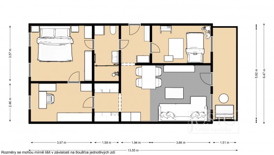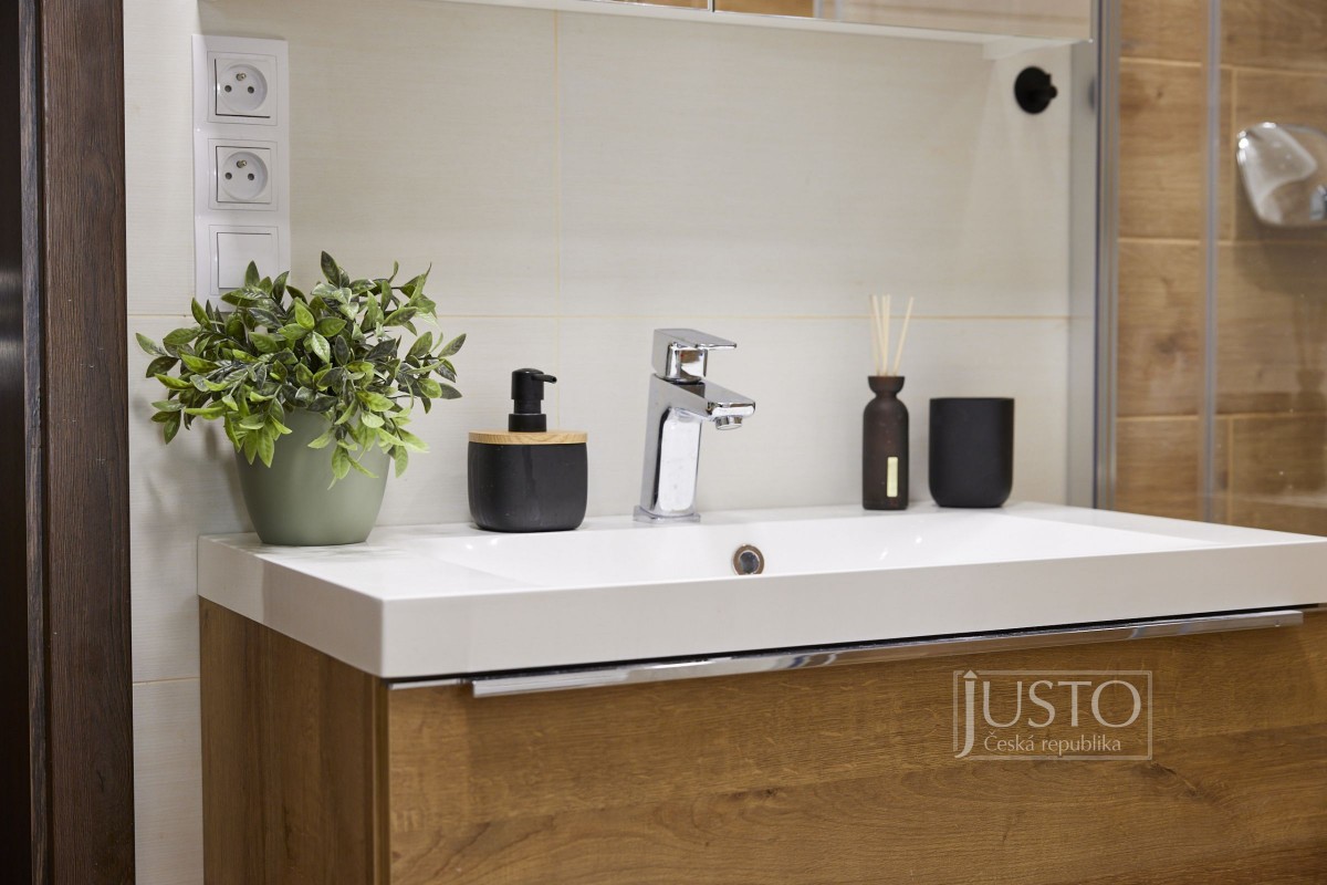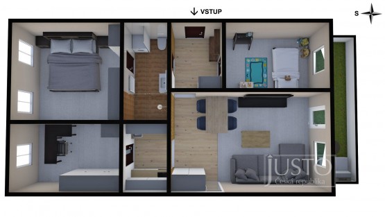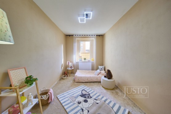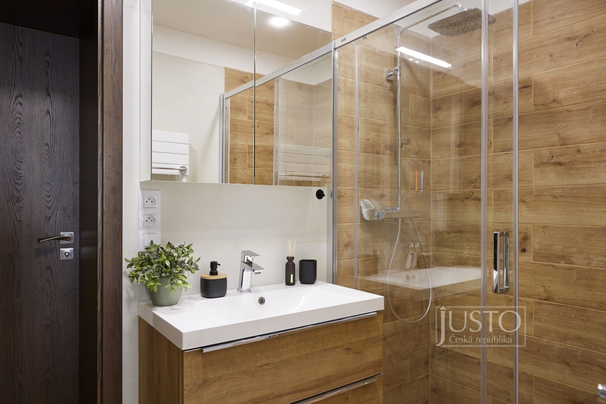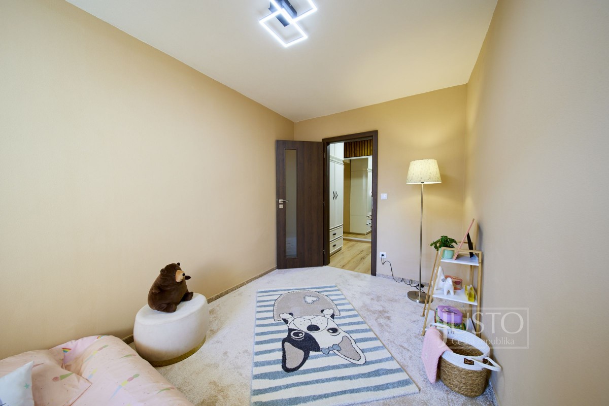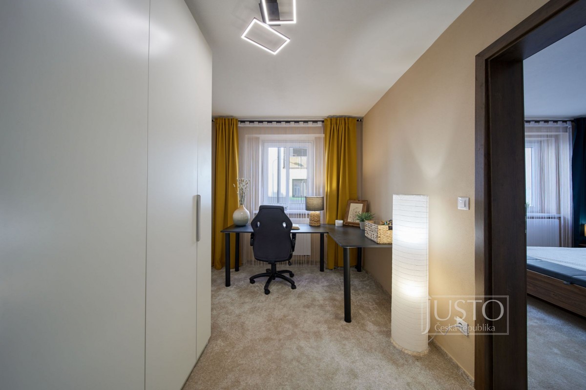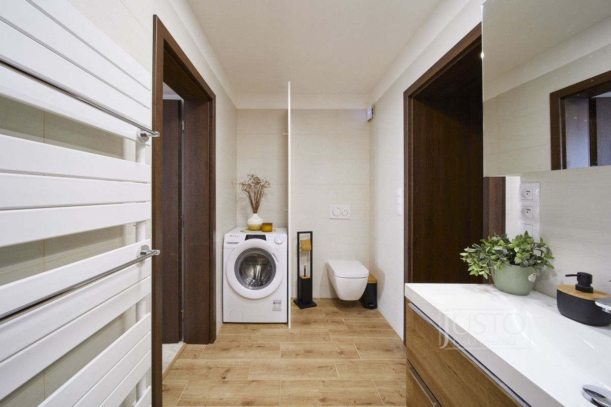 Jeden z pokojů slouží jako pracovna a nabízí i vestavěnou skříň. Z ložnice máte přístup do koupelny s velkým sprchovým koutem, toaletou i prostorem pro pračku a sušičku. Od nohou vás v koupelně zahřeje elektrické podlahové vytápění. Další místnost můžete využít jako pokoj pro děti nebo pro hosty.