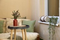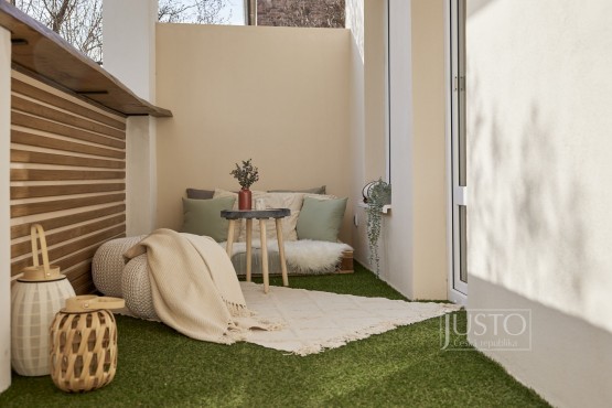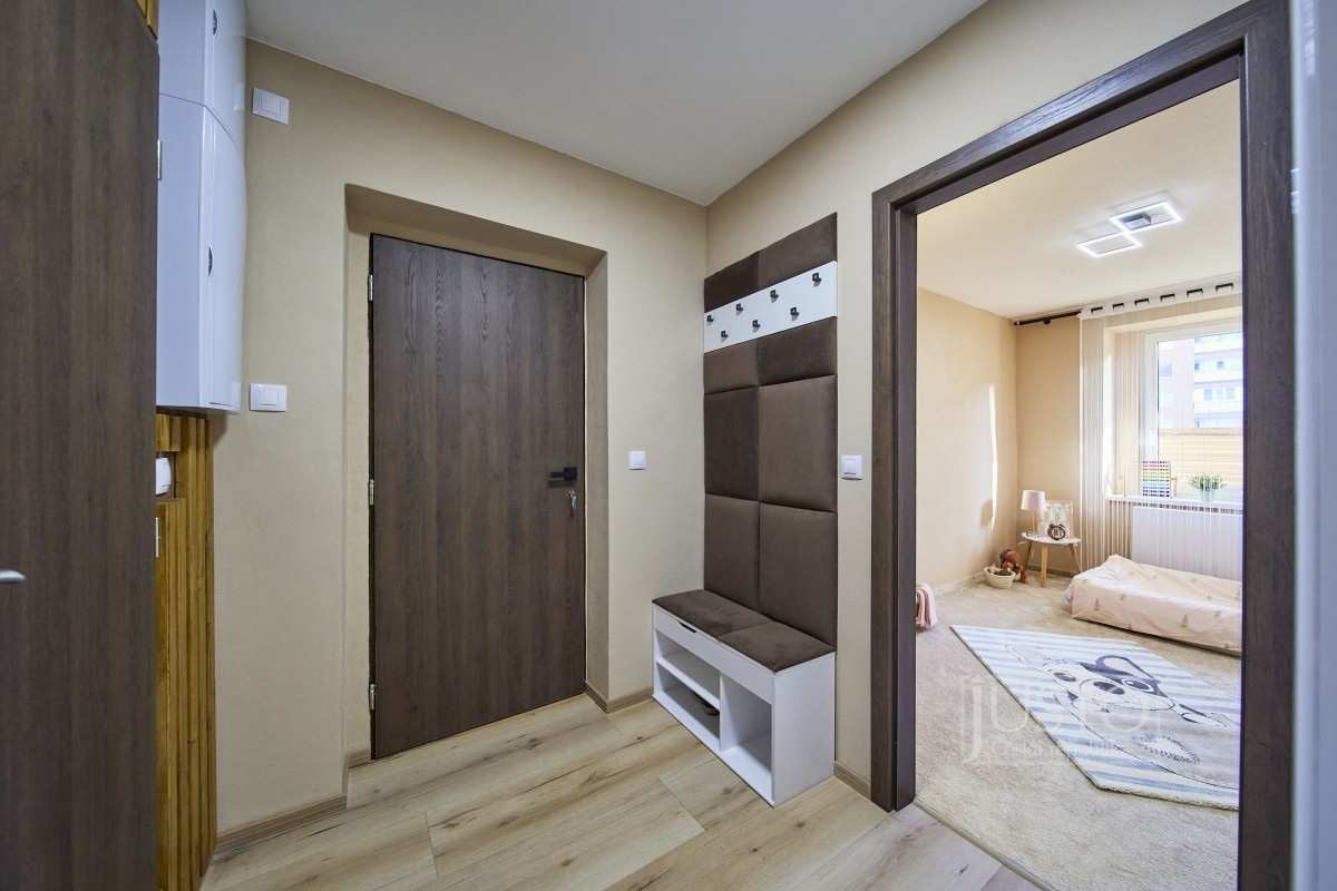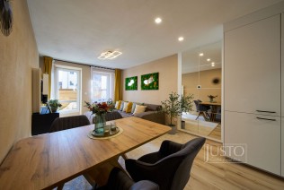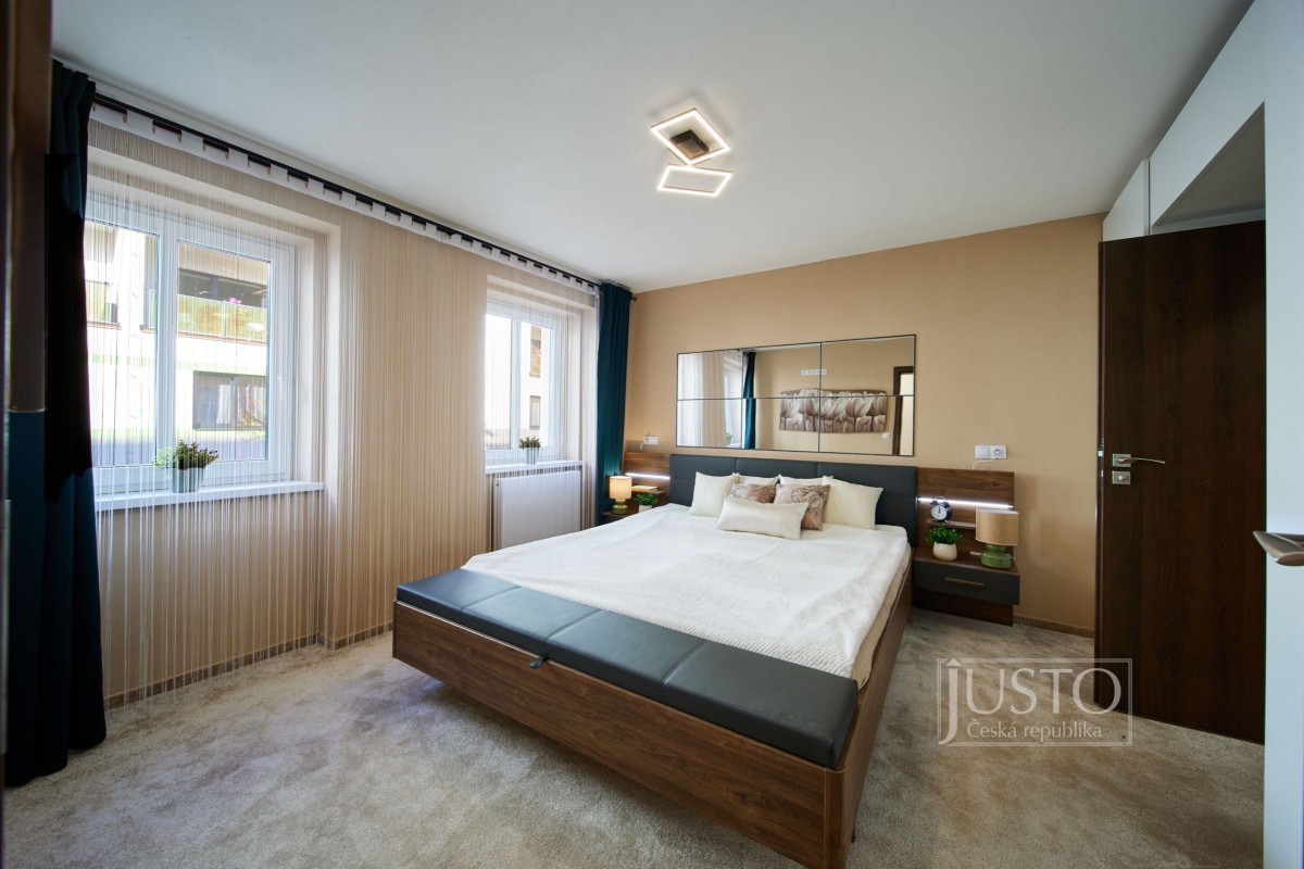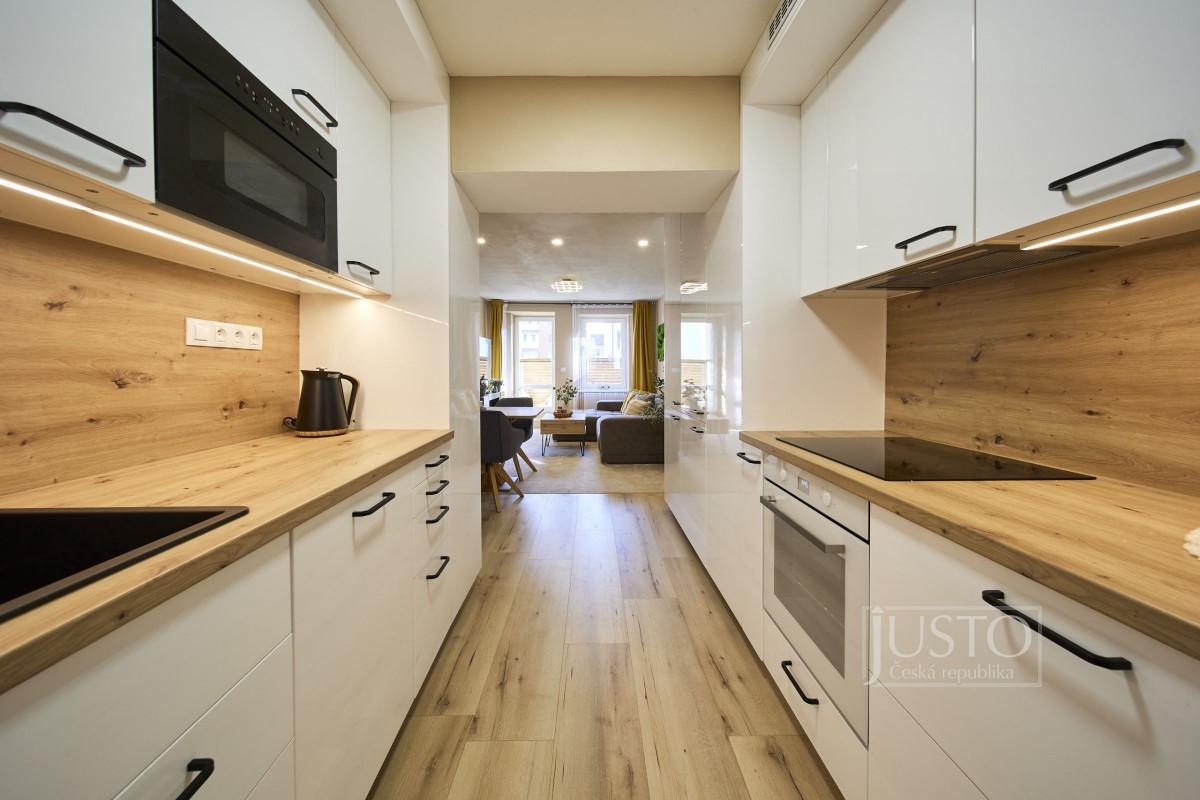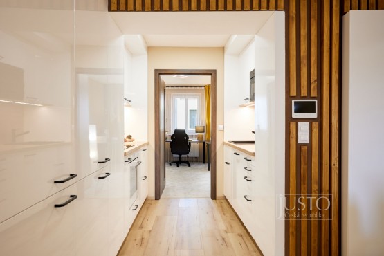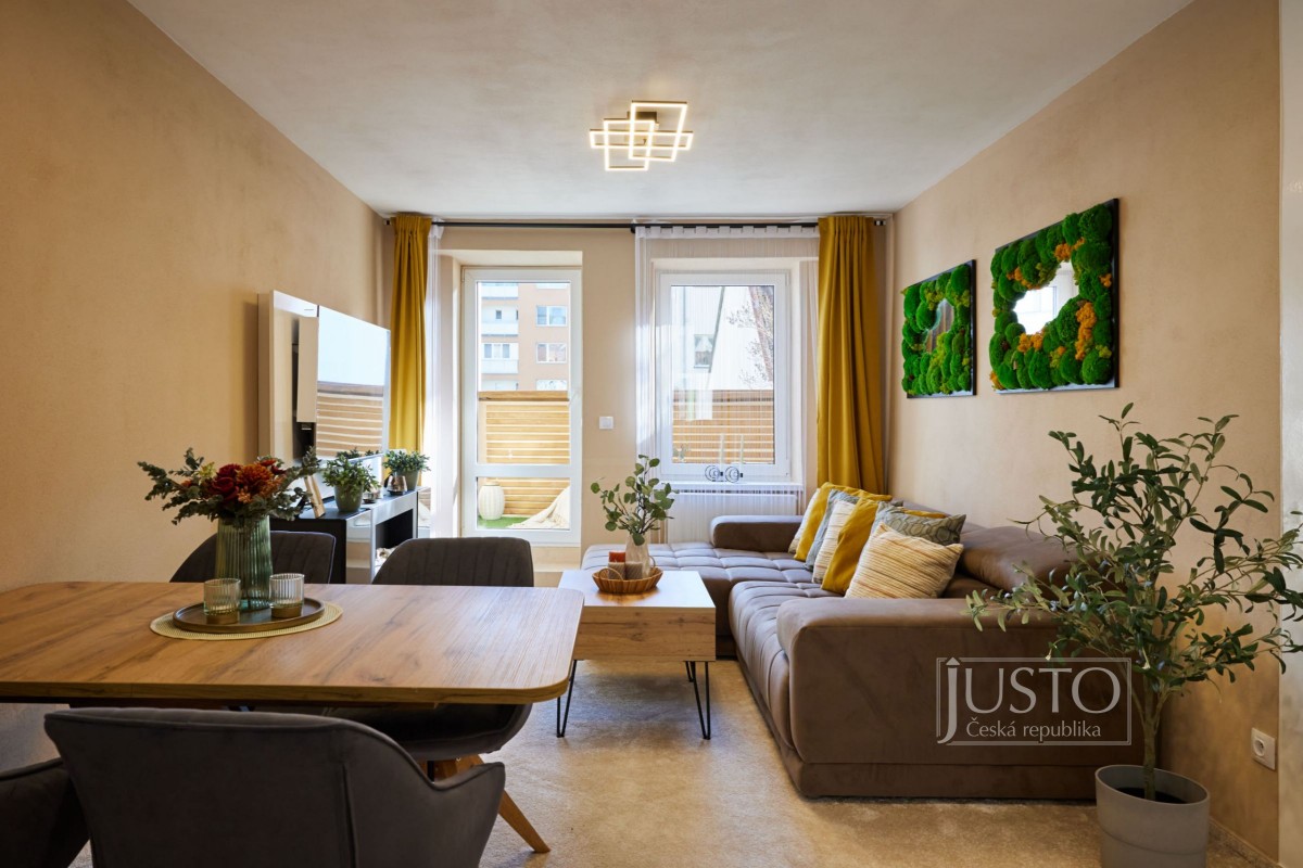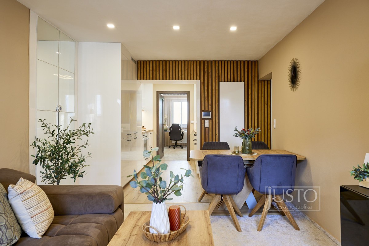 V roce 2022 majitelé byt velice vkusně a účelně zrekonstruovali. Zaměřili se nejen na stavební část rekonstrukce (podlahy, elektroinstalace, dveře, omítky a další), ale také na vybavení (koupelna, kuchyně, svítidla atd. ). Zateplením zdi v obývacím pokoji, kuchyni a pracovně a zateplením podlahy i stropu v celém bytě zlepšili tepelně izolační a akustické parametry bytu (akustické sádrokartony i okna s trojskly). Kuchyně vás osloví velice praktickým a moderním provedením. Je propojená s obývacím pokojem. Útulnost obýváku dodávají dřevěné prvky, barevná malba zdí a koberec. Krytá terasa má jižní orientaci do klidného vnitrobloku. Tam můžete využít i společnou zahrádku.