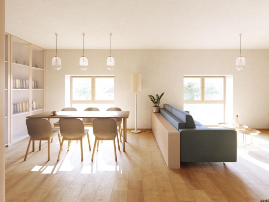 Teplo a ohřev vody zajištěn tepelným čerpadlem.