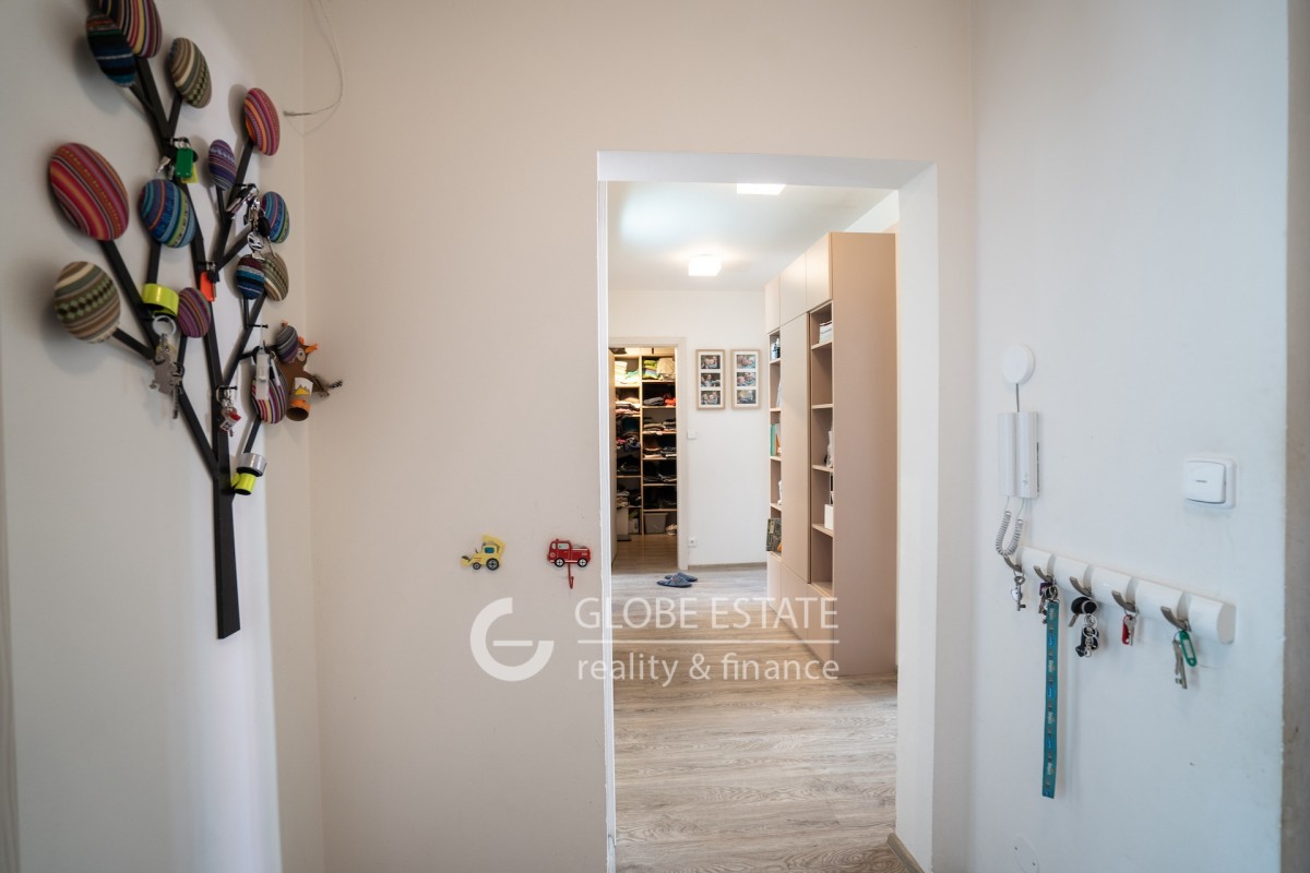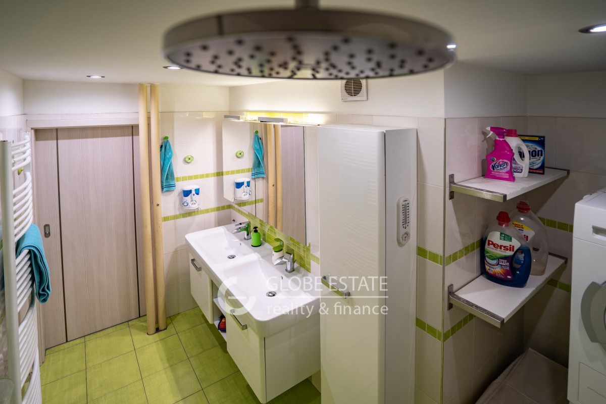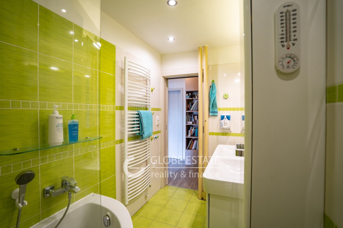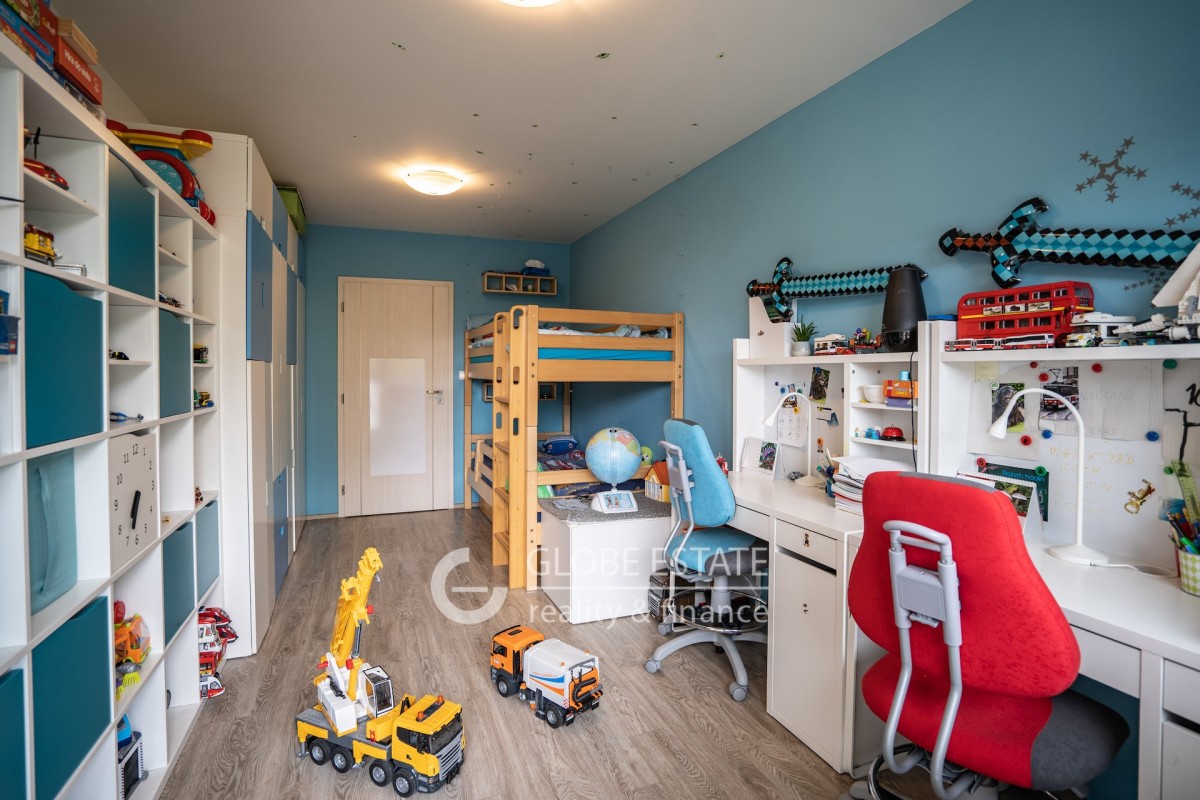 Byt o výměře 97 m2 prošel v roce 2014 kompletní rekonstrukcí, dispozičně se jedná o 4kk a součástí je sklep 10 m2 a komora 1, 5 m2 u vstupu. Do bytu se dostaneme z prostorné chodby domu po několika schodech. Z předsíně je pak vstup do dětského pokoje s přístupem na menší část lodžie 3 m2. Přes chodbu 10, 1 m2 se vstupuje do pracovny 10, 7 m2, ložnice 14, 1 m2, obývacího pokoje s kuchyňským koutem 25 m2, koupelny 5, 2 m2, samostatné toalety 1 m2 a komory 3, 4 m2. Obývací pokoj má vstup na větší část lodžie 8 m2. Kuchyňská linka na míru je důmyslně řešena do každého detailu a má i barový ostrůvek. Vybavena je troubou, mikrovlnkou, myčkou a indukční varnou deskou. Ložnice a pracovna je orientací na sever, ostatní pokoje jsou na jihovýchod. Lodžie má stínící markýzu na manuální ovládání s možností el. ovládání. V bytě jsou rozvody pro zabezpečovací systém a ve všech místnostech je síťová a anténní zásuvka. V bytě je vyveden optický kabel pro vysokorychlostní internetové připojeníové připojení.