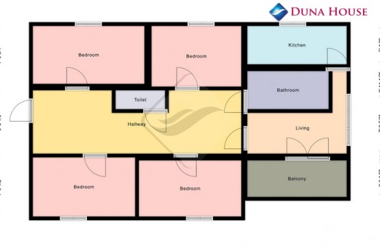 Byt má prostornou vstupní halu, obývací pokoj se vstupem na balkon, samostatnou kuchyň, čtyři oddělené ložnice, koupelnu s vanou a toaletou a další samostatnou toaletu.