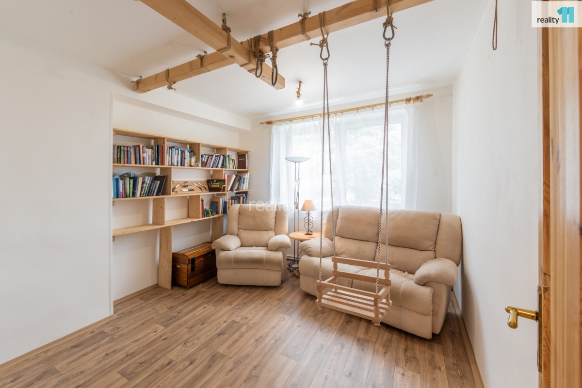 V prvním podlaží bytové jednotky se nachází prostorná chodba, obývací pokoj, kuchyně , ložnice, pokoj, který nyní slouží jako knihovna, koupelna s vanou, oddělené sociální zařízení WC.