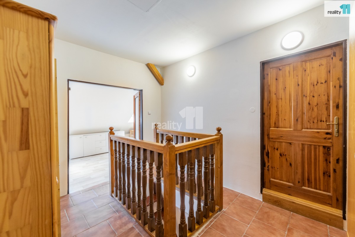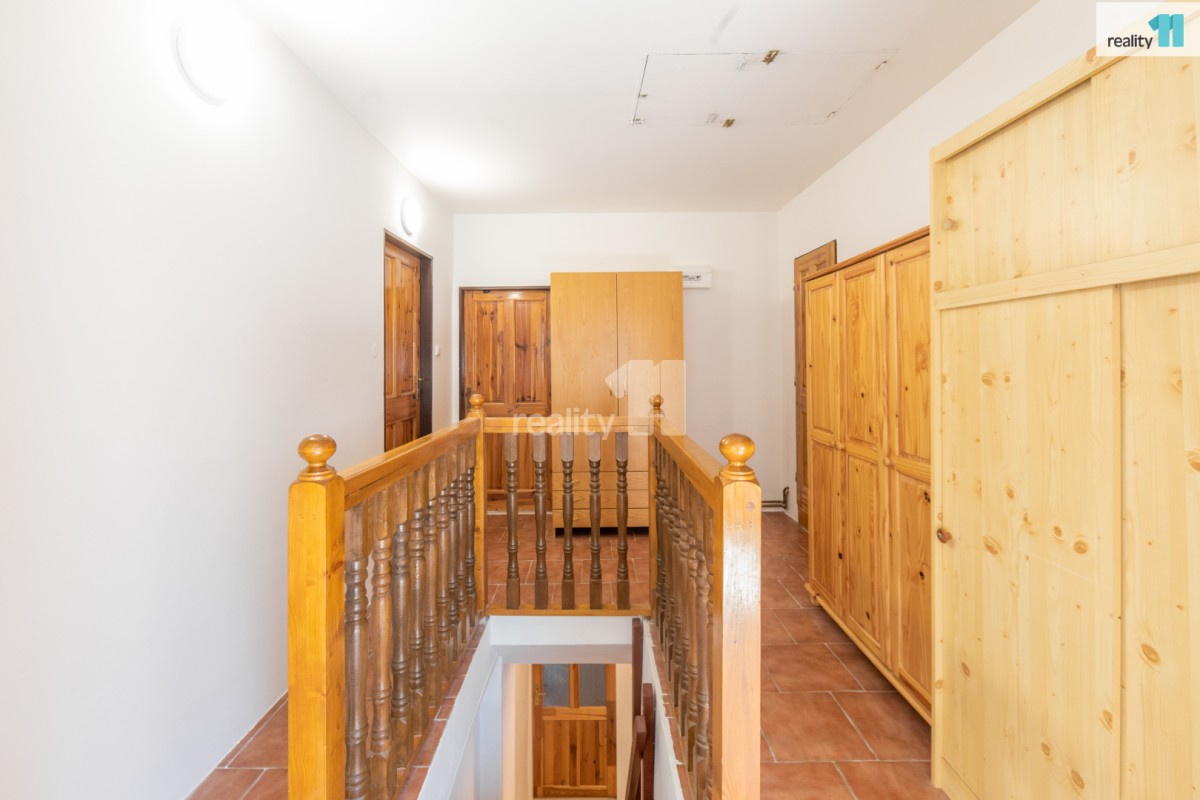 Po dřevených schodech se dostáváme do druhého podlaží kde jsou umístěny 3 pokoje, koupelna se sprchovým koutem a sociální zařízení WC. Jeden z pokojů má vlastní menší šatnu. Z chodby je možné se dostat do půdních prostor domu.