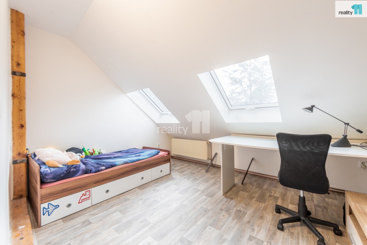 Po dřevených schodech se dostáváme do druhého podlaží kde jsou umístěny 3 pokoje, koupelna se sprchovým koutem a sociální zařízení WC. Jeden z pokojů má vlastní menší šatnu. Z chodby je možné se dostat do půdních prostor domu.