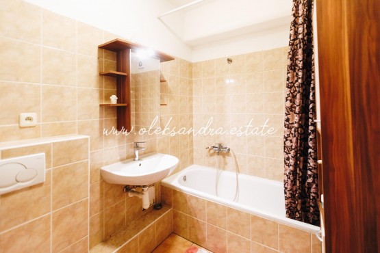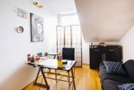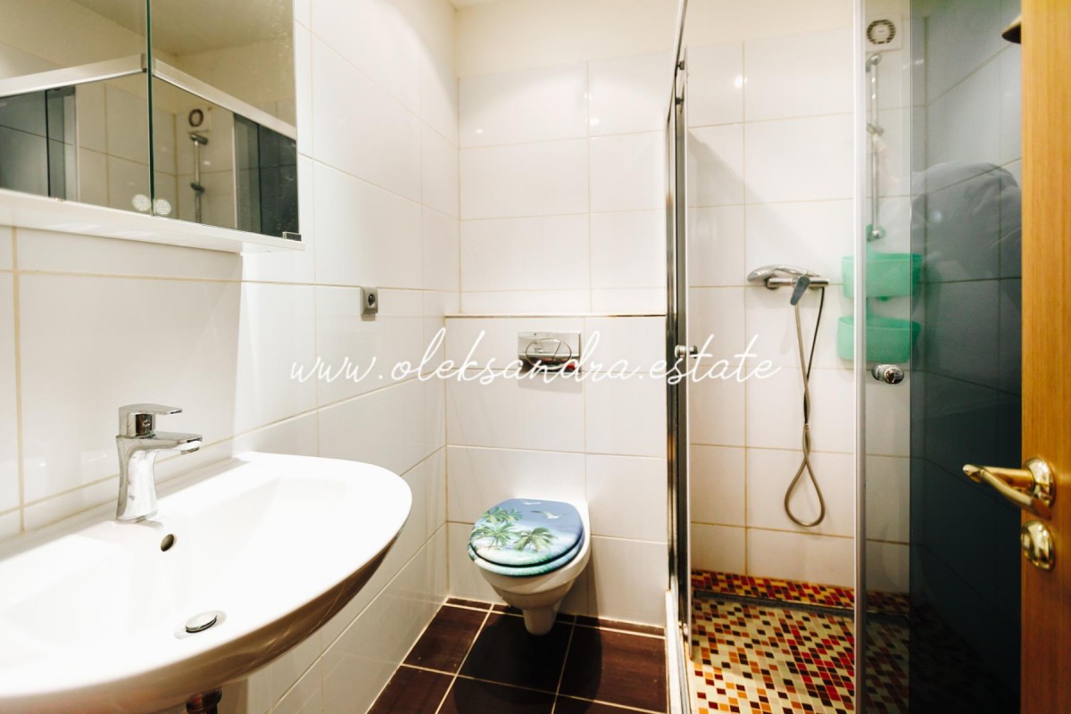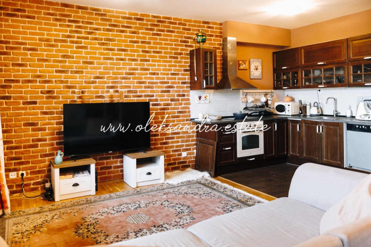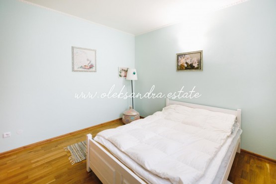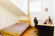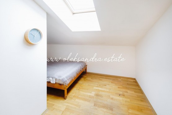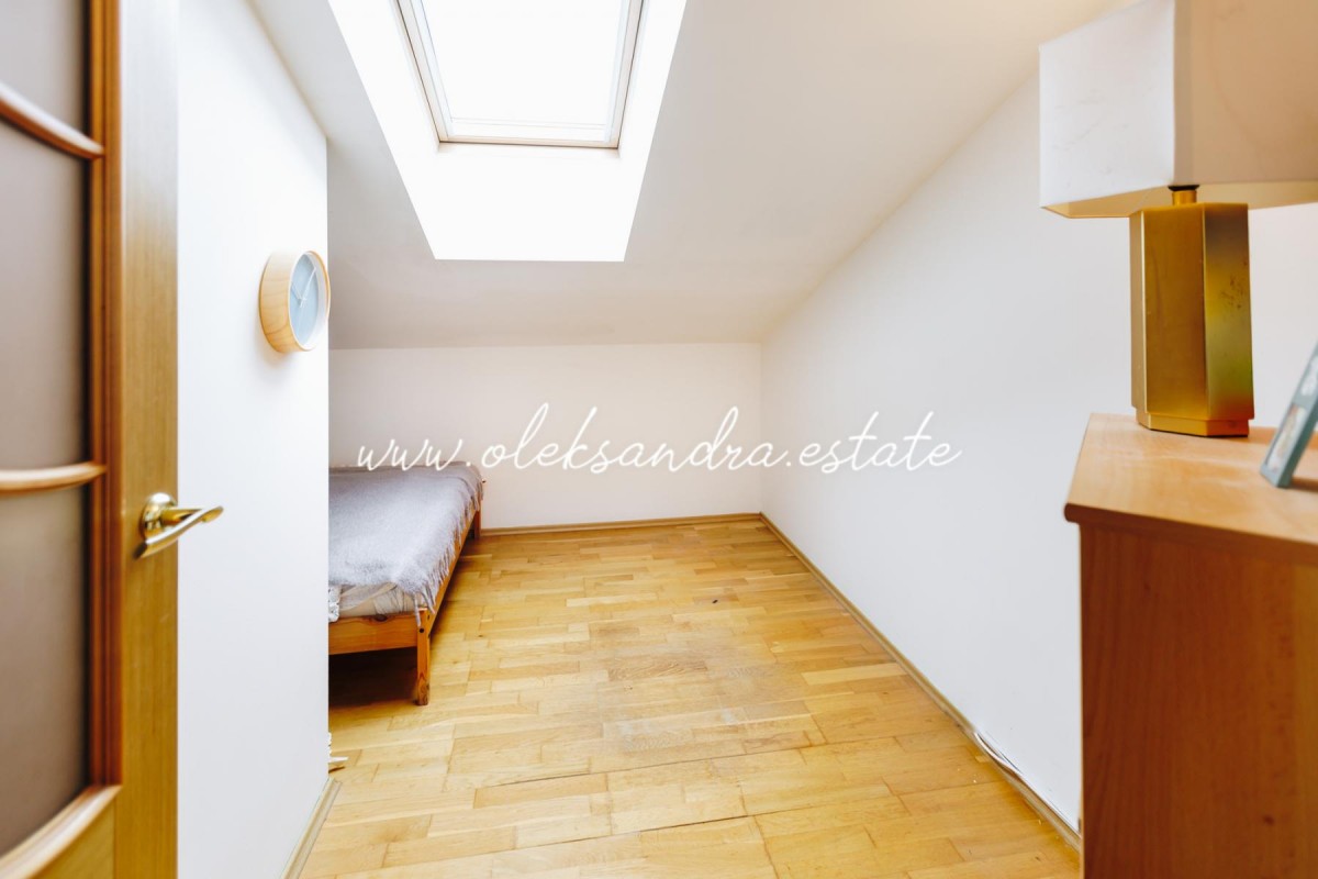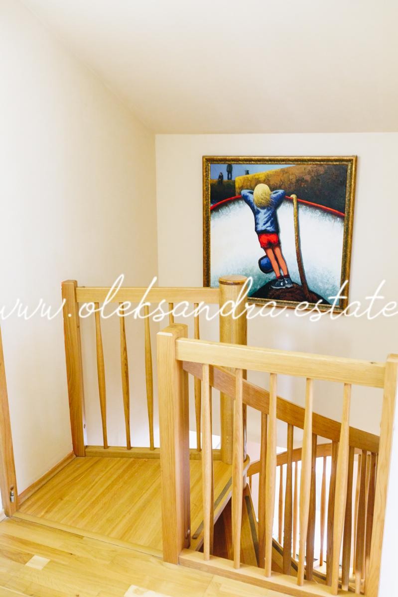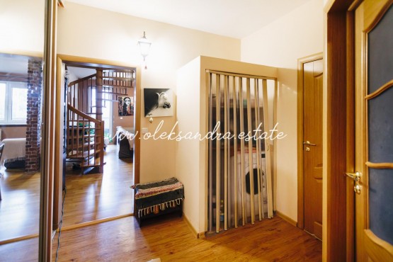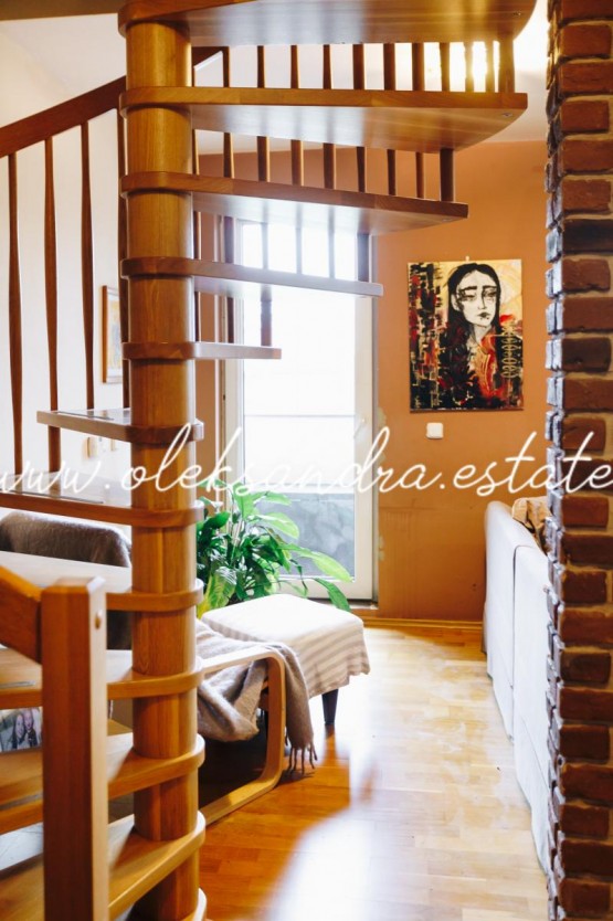 Ve spodním patře bytu se nachází hlavní obytná část, která se skládá z obývacího pokoje, jídelny a kuchyně. Dále je ve spodním patře ložnice, předsin a koupelna s toaletou. Ve vrchním patře jsou tři ložnice, pracovna a koupelna. Kuchyňský kout včetně spotřebičů je součástí vybavení .