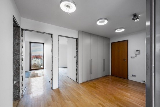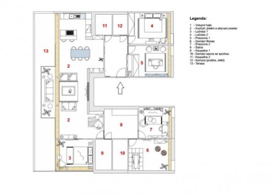 Důmyslně řešenou dispozici bytu ve tvaru písmene U tvoří vstupní hala, otevřený koncept obývacího pokoje s kuchyňským koutem a zimní zahradou, dalších 5 neprůchozích pokojů, 2 koupelny, technická místnost a nová domácí sauna.