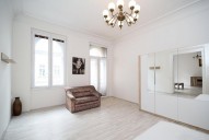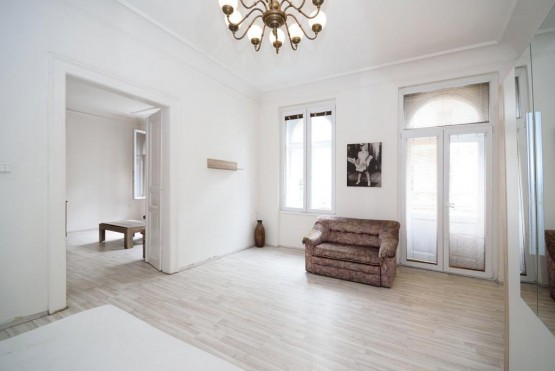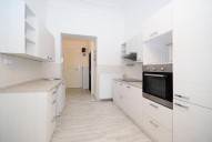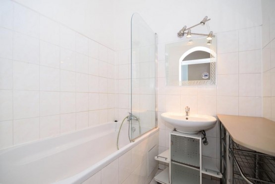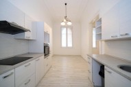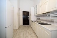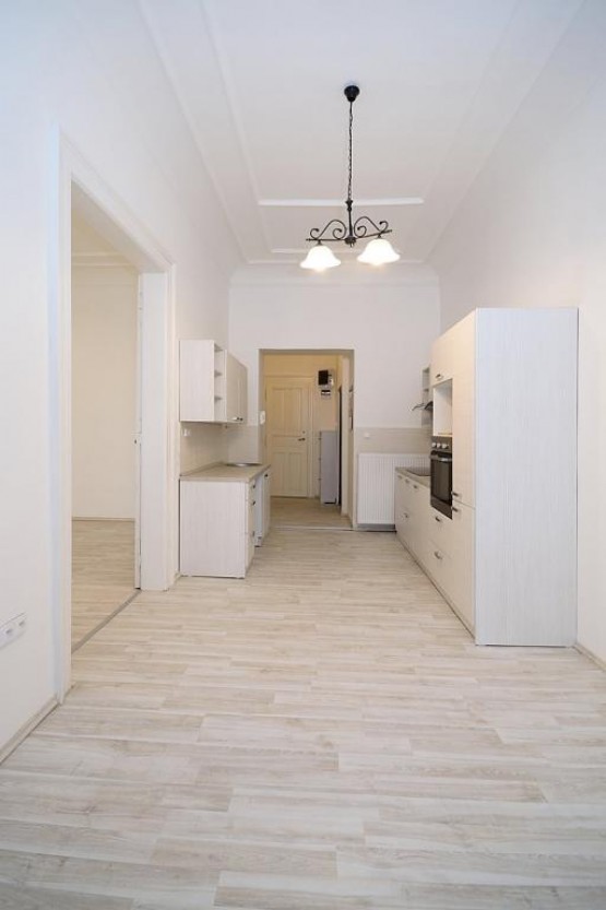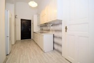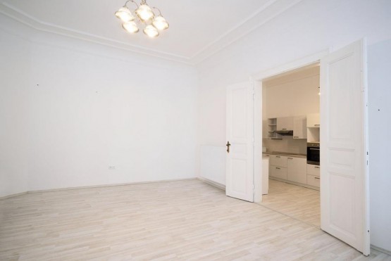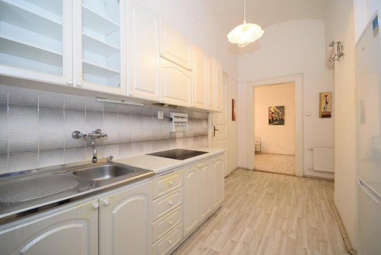 První část bytu tvoří samostatná jednotka o dispozici 1+1, která je orientována na jižní stranu. Tato jednotka prošla kompletní rekonstrukcí před přibližně dvěmi lety. Bytu dominuje prostorná kuchyň s novou kuchyňskou linkou a jídelnou, ze které je možný přístup do velkého obývacího pokoje. Byt má samostatnou toaletu a koupelnu.