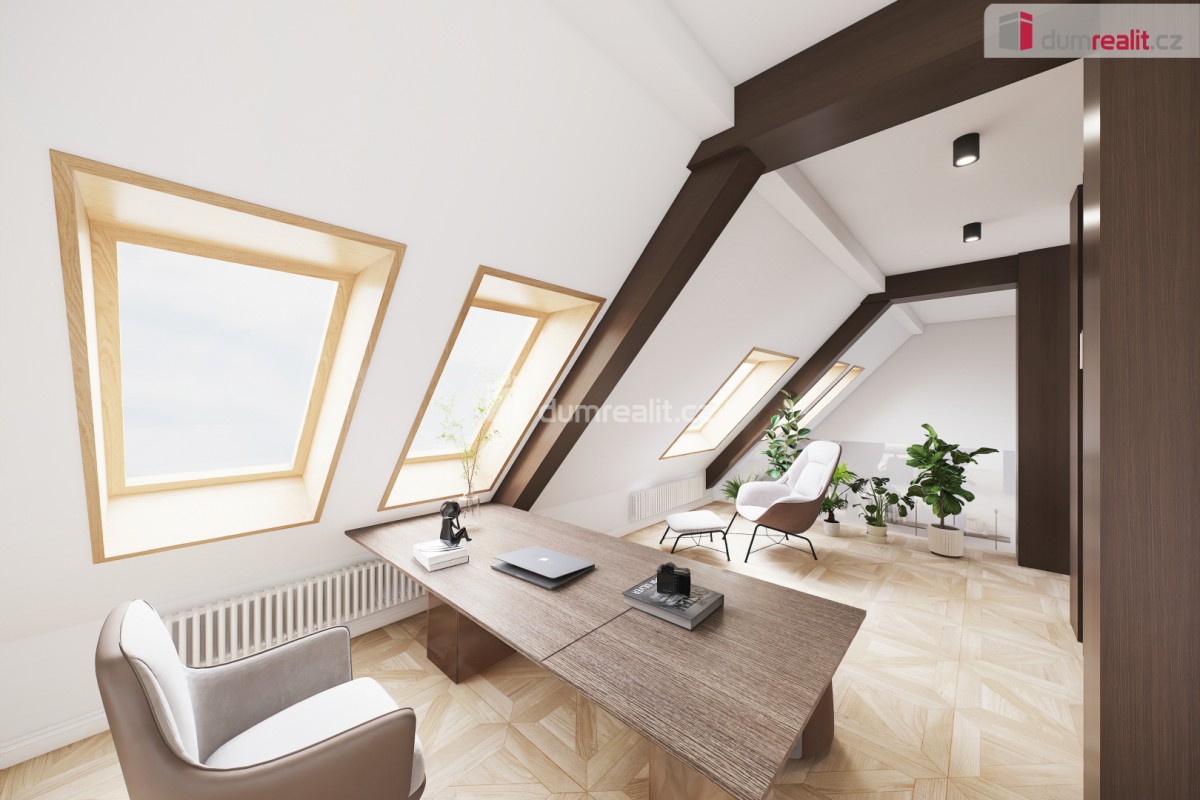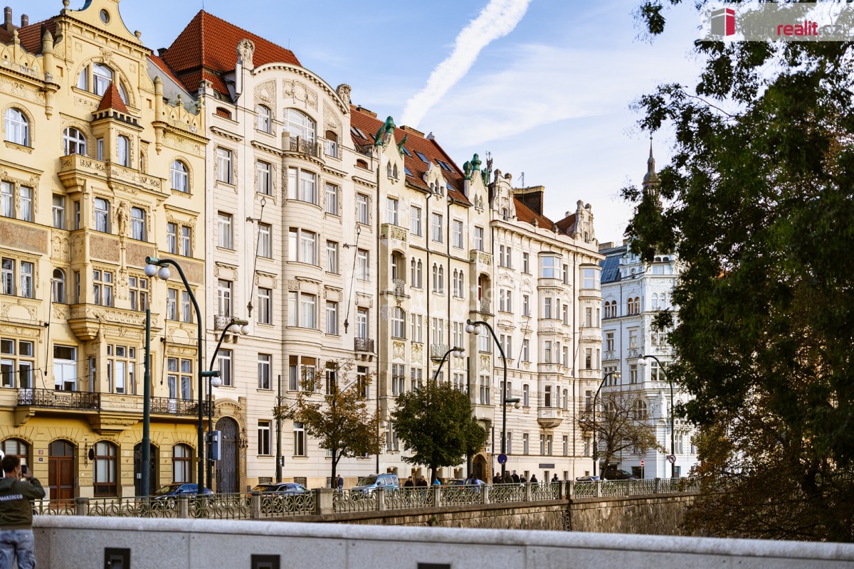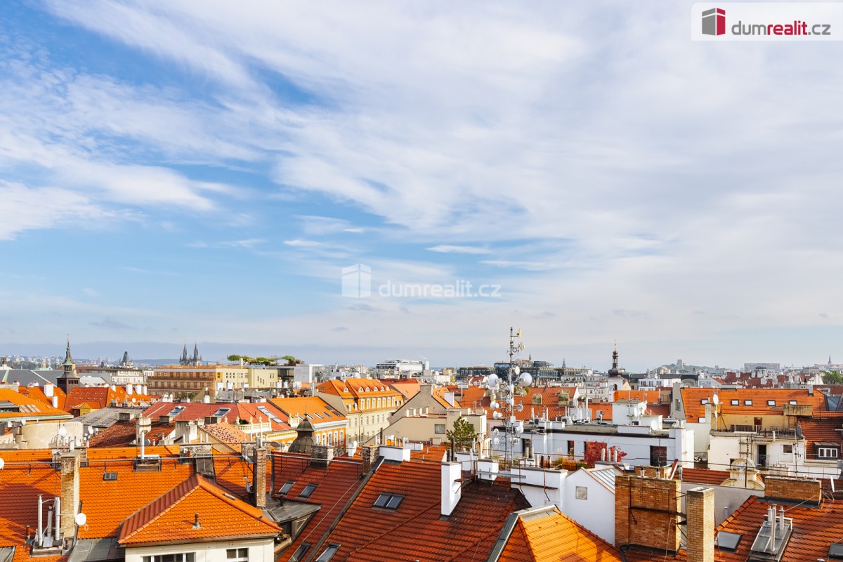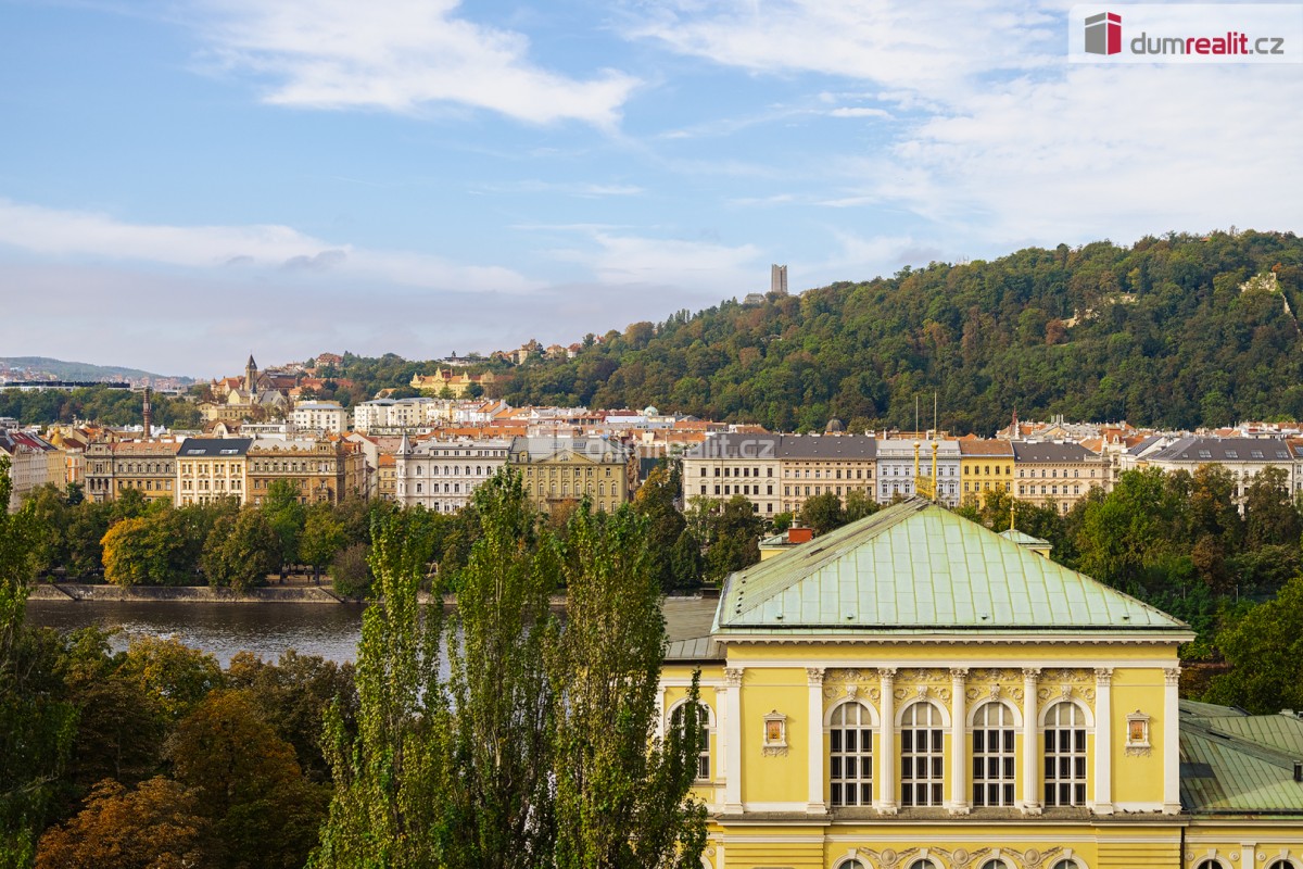 Prodej mezonetového bytu s unikátním výhledem na Hradčany, Petřín, Vltavu, protější Žofín a další pražské památky je umístěn v 7. a 8. podlaží měšťanského domu z počátku 20. století včetně výtahu. Dům se secesními a novo...gotickými prvky je kulturní památkou a byl vybudován podle návrhu architekta Kamila Hilberta, který se proslavil především dostavbou katedrály sv. Víta. Budova je pečlivě zrekonstruována, vstupní vestibul a schodiště jsou bohatě zdobeny původní štukovou dekorací, barevnými vitrážovými okny, keramickou dlažbou a kovovým tepaným zábradlím. Dům stojí v atraktivní lokalitě v těsné blízkosti Národního divadla.