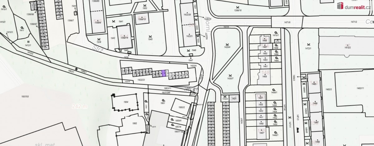 Budova řadových garáží je samostatnou stavbou, nacházející se na spojnici ulic Horní a Strž.