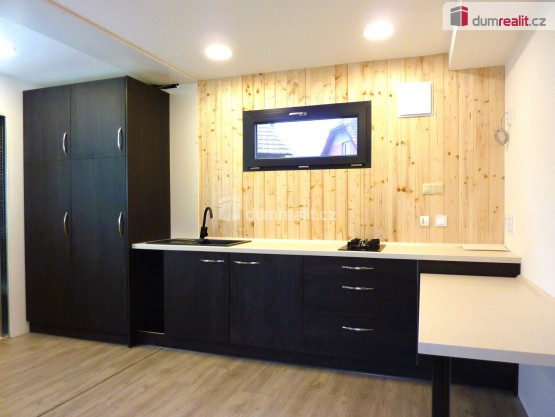 Kuchyně - kuchyňská linka včetně dřezu a baterie, vestavěná plynová dvouplotýnková varná deska na PB, lednice (gorenje), přípojka na pračku.