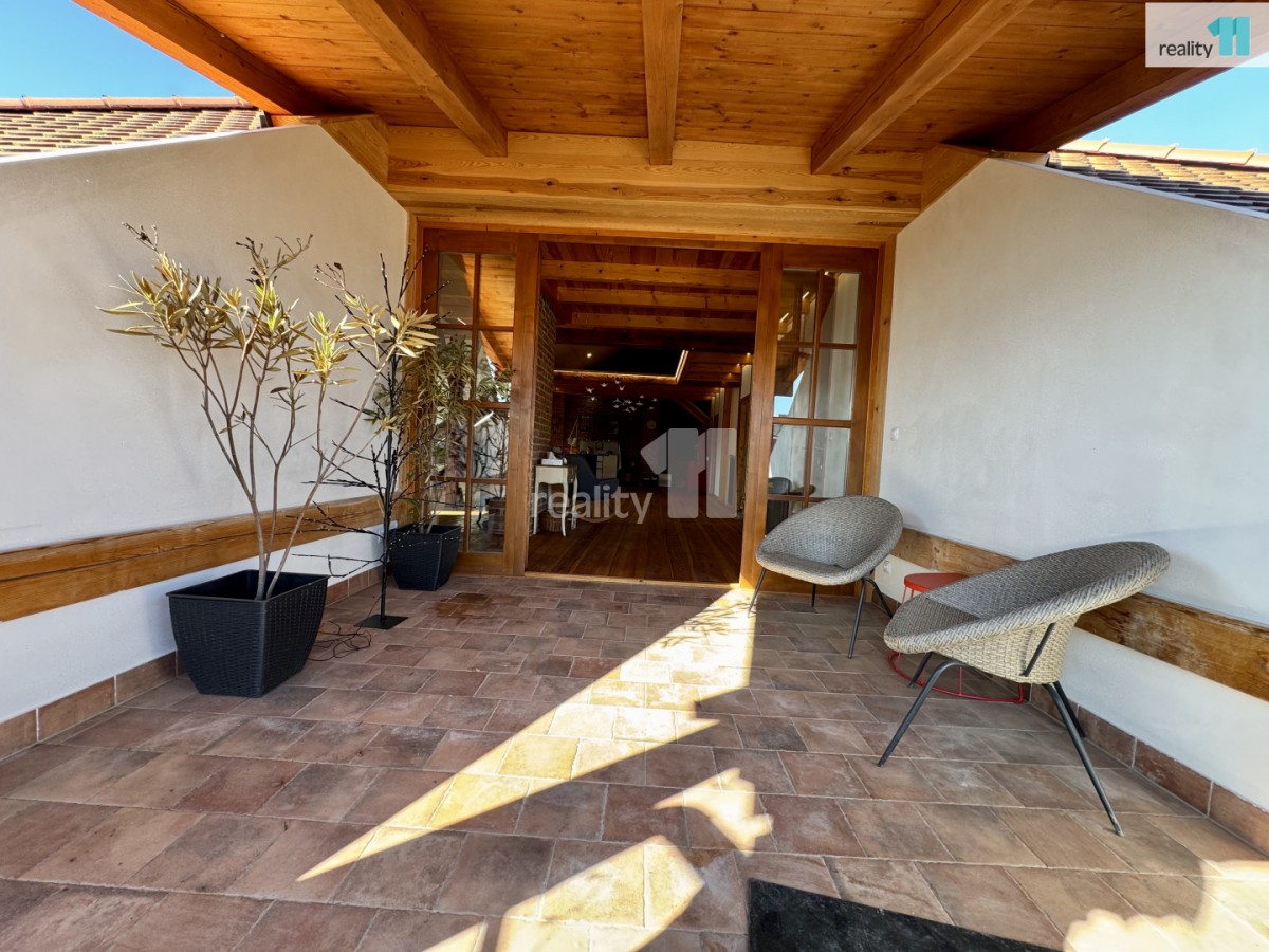 V horním patře je podkrovní byt 3+kk o ploše 180 m² s terasou a výhledem na tvrz. Vhodný pro vlastní bydlení, dlouhodobý pronájem i rozšíření ubytování.
