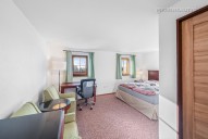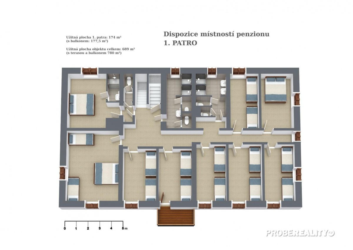 4 dvoulůžkové pokoje (1 s vlastní koupelnou a sociální zařízení WC, ostatní sdílejí koupelnu s sociální zařízení WC) a 2 kuchyňky na patře.