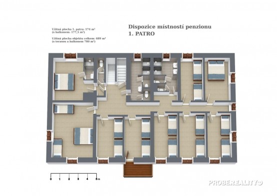 Užitná plocha: 689 m2 (2 nadzemní podlaží + podkroví), s terasou a balkonem 780 m2