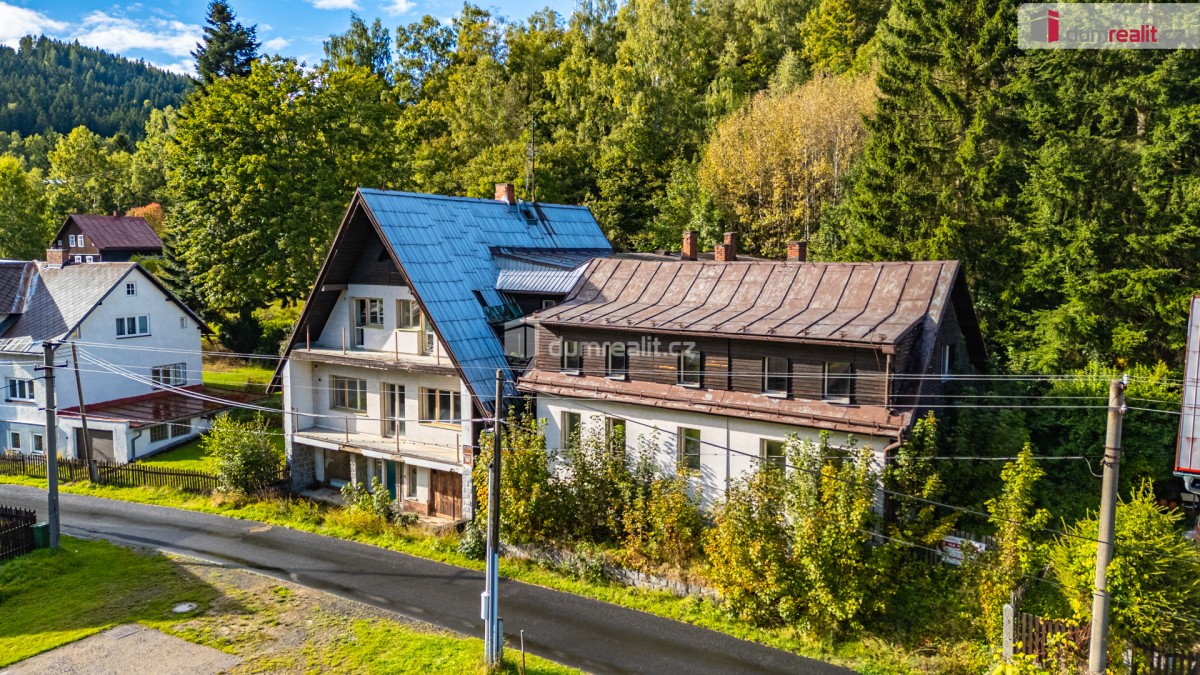 Dumrealit. cz Vám nabízí příležitost koupě cihlového domu vhodného na provozování pensionu, hotelu, ubytovny či dlouhodobých a krátkodobých pronájmů. Dům - horská chata se nachází v klidné oblasti Krušných hor v obci Stř...íbrná nedaleko Kraslic. Objekt obklopuje pozemek o rozloze 2671 m², zastavěná plocha tvoří 506 m², užitná plocha objektu je cca 950 m². Celkem je zde 14 pokojů, některé s vlastní koupelnou, některé se sdíleným sociálním zařízením. Dále je zde restaurace s jídelnou, několik skladů, technických místností, kotelna, sklep, garáž, koupelny, soc. zařízení a navíc je zde bývalý byt pro správce. Do objektu je zavedena elektřina, vodovodní řad. Přes pozemek teče potok, který je dalším zdrojem vody. Odpad je nyní do septiku, ale není problém napojit na kanalizaci, která je v ulici (cca 2 m). Plynové vedení je v blízkosti. Vytápění je možné na elektřinu (tepelné čerpadlo) či na kotel na pevná paliva. Střecha je plechová, krov je v dobrém stavu. Parkování je možné na pozemku přímo naproti objektu. Dojezdová vzdálenost k hraničnímu přechodu s Německem je do 5 minut. Lokalita má výborné podmínky pro letní i zimní sporty a rekreaci, k dispozici je lyžařský areál Stříbrná, do 7 minut autem je vzdálen lyžařský areál Krajka a Saporo v Kraslicích. K dispozici spousty běžeckých tras až do Německa - Krušnohorská magistrála. Blízká Bublava je také úžasná pro letní turistiku se spousty turistickými a naučnými stezkami. Veškerá občanská vybavenost je jak v Kraslicích tak v Lubech. Do dvaceti minut jízdy jsou vzdáleny Karlovy Vary, které se staly součástí kulturního dědictví UNESCO. Zde je veškerá občanská vybavenost, supermarkety, úřady, banky a další. V okolí Stříbrné je bezpočet turistických a cyklotras které pokračují po perfektních cyklostezkách dále do Německa. Cena zahrnuje provizi a právní servis. V případě zájmu Vám doporučíme naše prověřené hypoteční poradce. Ev. číslo: 650477. Energetický štítek: G (30 kWh/m2/rok).