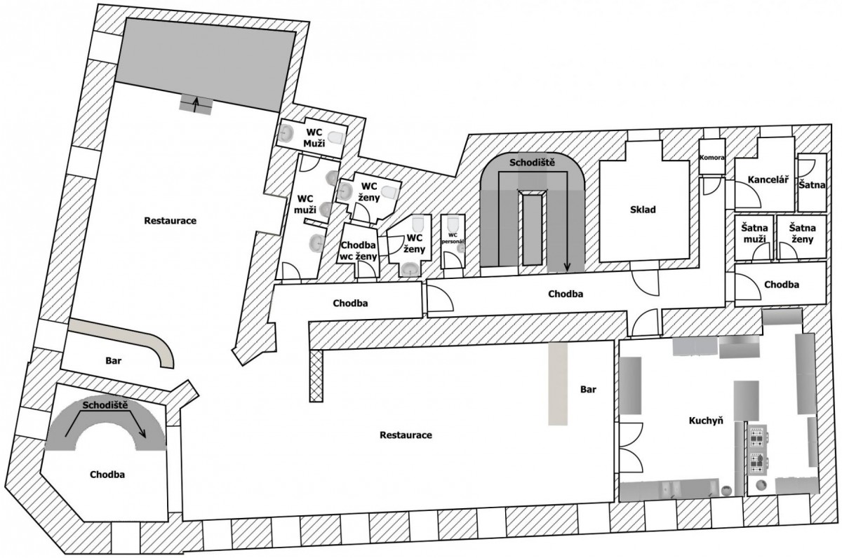 Nebytové prostory jsou umístěny v roh...ovém secesním domě a mají samostatný vstup přímo na rohu domu. Za dveřmi se nachází vstupní místnost a schody do polosuterénu. Nemovitost je kolaudovaná jako restaurace.