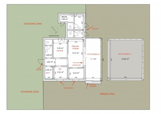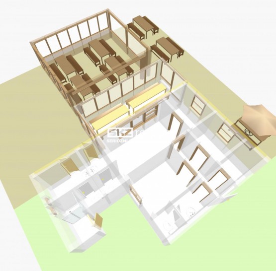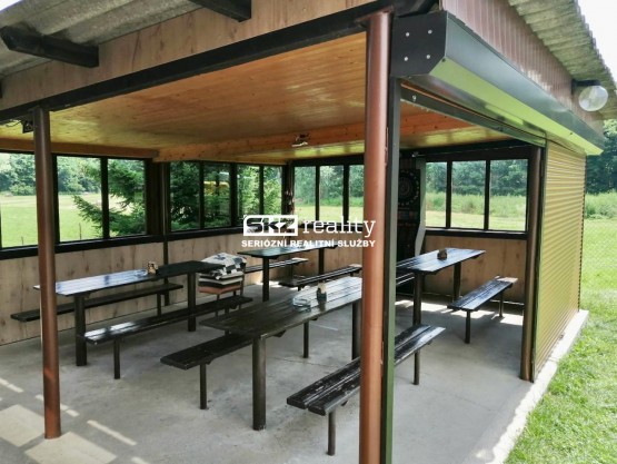 Základem všeho je zděná stavba, kde najdete vše, co k provozování hostinství potřebujete. Dispozice jsou znázorněny na fotografii půdorysu. Zadním vstupem se dostanete do chodby. Vlevo se nachází 2 prostory: sociální zařízení WC s umyvadlem a kuchyně. Vpravo je přípravna, čep s výdejním okénkem a prostor pro výdej zmrzliny. Výdej jídel, fritéza, konvektomat, mikrovlná trouba atd. je největším pracovním prostorem a je na konci chodby s výdejním oknem do prostoru uzavřeného posezení pro hosty. Dispoziční uspořádání stavby je deální pro rychlou a pohodlnou přípravu jídel a nápojů se snadným obstaráváním hostů. Na severovýchodní straně se nachází přístavba, kde najdete sociální zařízení WC pro hosty a sprchový kout pro personál. Součástí nabídky je mj. vagon, karavan, dva prodejní stánky a 2 foliovníky. Lze využít i studnu pro čerpání užitkové vody.