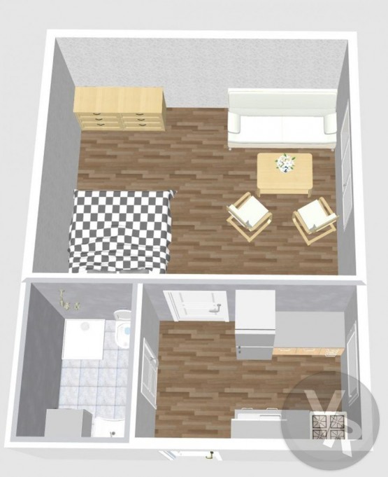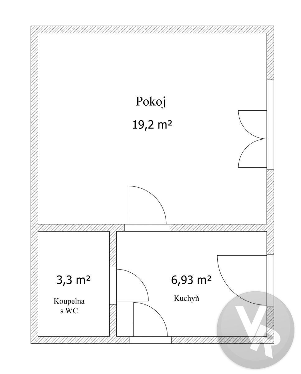 Dispozice: Vstup do bytu je ze společné chodby do kuchyně o velikosti 6, 93 m2, z kuchyně je vstup do koupelny se sprchovým koutem a toaletou dohromady o velikosti 3, 3 m2 a dále se z kuchyně vchází do pokoje o velikosti 19, 2 m2.