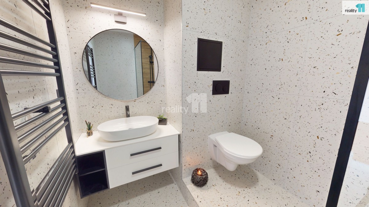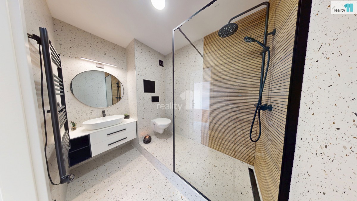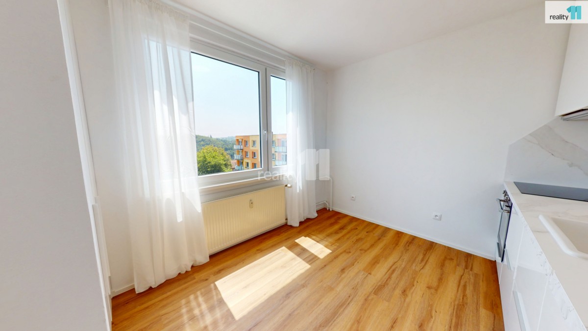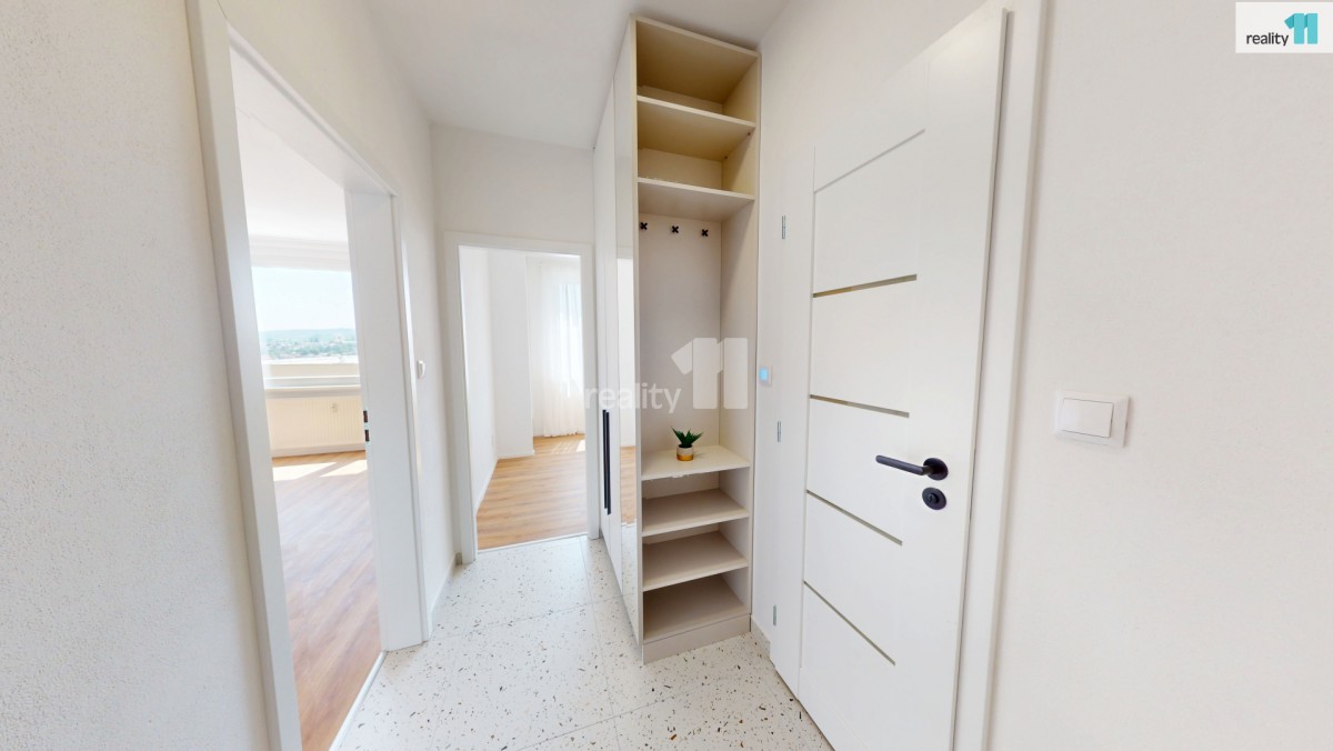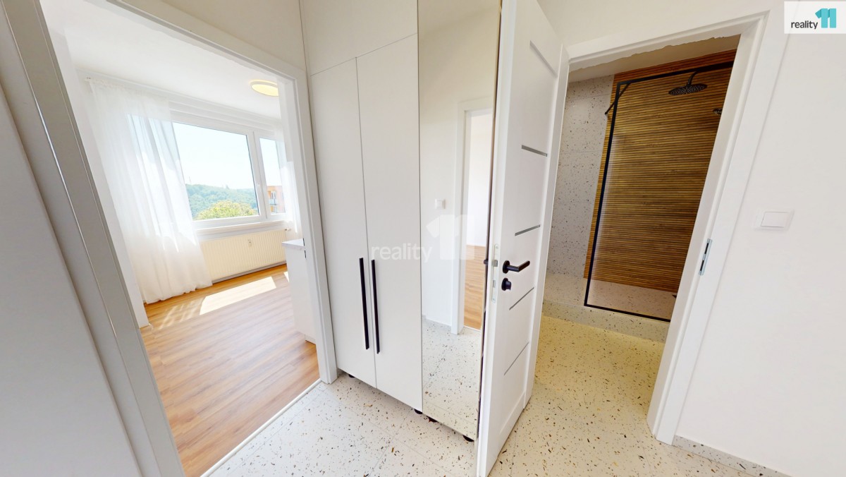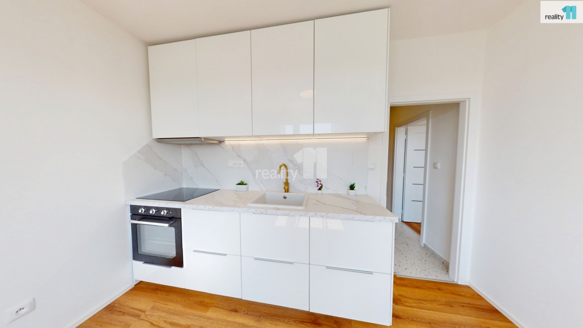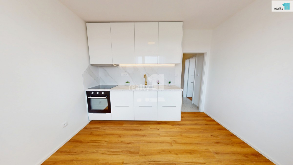 Hned při vstupu vás přivítá prostorná chodba s vestavnou šatní skříní na míru, která elegantně řeší úložný prostor. Součástí bytu je také nádherná designová koupelna se sprchovým koutem, kde nechybí ani přípojky na pračku a sušičku. Další místností je kuchyň, která zaujme na první pohled – čeká vás zde zcela nová kuchyňská linka. Elegantní provedení a dostatek úložného i pracovního prostoru vytvářejí ideální zázemí pro každodenní vaření i chvíle s kávou u okna. Je to prostor, který vás bude bavit – ať už vaříte každý den nebo jen občas. Poslední místností je prostorný a světlý pokoj, který díky své velikosti umožňuje pohodlně rozdělit zónu pro spaní i odpočinek. Byt je po celý den příjemně prosvětlený.