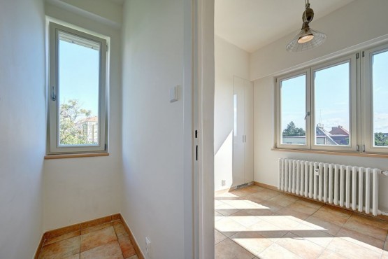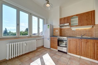 Na podlahách je dlažba, v pokoji nově přebroušené a nalakované parketová podlaha.