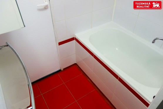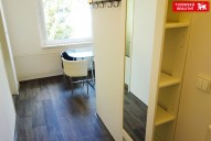 Bytové jádro je umakartové nově obložené dlažbou a obklady. Koupelna je s vanou, sociální zařízení WC je částečně oddělené. V kuchyni je kuchyňská linka se sporákem, stůl, židle a v pokoji je šatní skříň. K dispozici je i sklepní kóje, do které se vleze i kolo a společná kolárna či kočárkárna. Úklid společných prostor je placený.