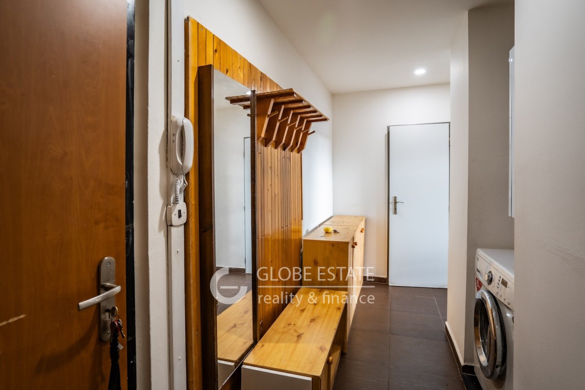 • střed bytu tvoří rekonstruované zděné jádro se společnou koupelnou s toaletou. Vzhled k umístění pračky, která stojí v chodbě současně s lokální karmou na ohřev vody, nabídne koupelna více prostoru,