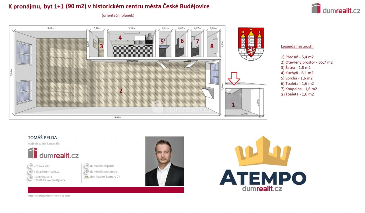 + zálohy. Více info Vám poskytneme v realitní kanceláři A TEMPO. . Dumrealit. cz Vám nabízí pronájem prostorného, světlého bytu 1+1 přímo na náměstí Přemysla Otakara II ve městě Česk...é Budějovice. Byt je řešen jako "open space" ve 2. patře zděné historické budovy s výhledem na náměstí. V bytě jsou položeny parketová podlaha, v kuchyni lino. Dispozici prostor naleznete na orientačním plánku mezi fotografiemi. Prostor je možné pronajmout i jako kancelářský prostor. Cena nájemného činní 14. 000, - Kč + poplatky, elektrická energie a plyn se převádí na nájemce. Byt. jednotka má nádherný výhled na celé historické náměstí města České Budějovice. Více info Vám poskytne realitní makléř Tomáš Pelda z realitní kanceláře A TEMPO fungující pod ochrannou známkou dumrealit. cz. Ev. číslo: 649899. Energetický štítek: G