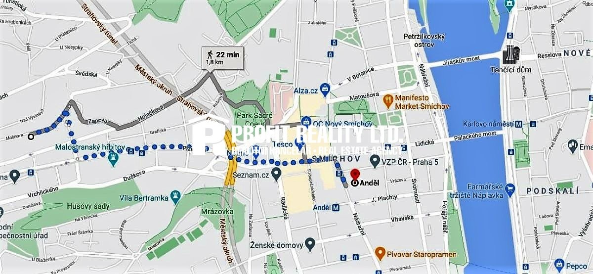Nabízíme k pronájmu 1+kk, 17m2, přízemí, malá zahrádka. Byt se skládá z dvou malých místností, jedna je ložnice s kuchyní a s úložným prostorem a druhá je koupelna... s vanou. Byt je zcela vybaven. Kuchyňský kout - kuchyňská linka, sklokeramická deska, lednice, digestoř, pračka, podlaha dlaždice. Pokoj - dvoulůžko, poličky, stolek , židle. , podlaha - dlaždice, koberec. Byt je vytápěn el. přímotopy, voda - el. boiler ( noční proud). Občanská vybavenost v blízkosti. MHD, 9 minut chůze k tramvaji, 8 minut autem, či 20 minut chůze od Metra B a k nákupnímu centru Anděl. Zvířata povolena. K nastěhování ihned.